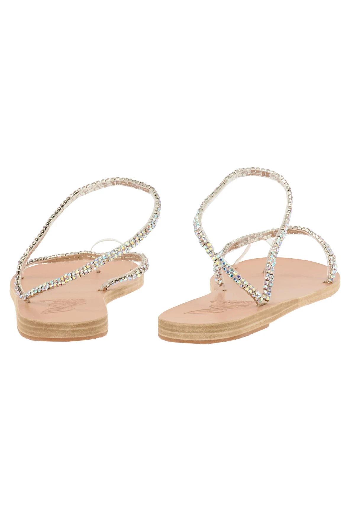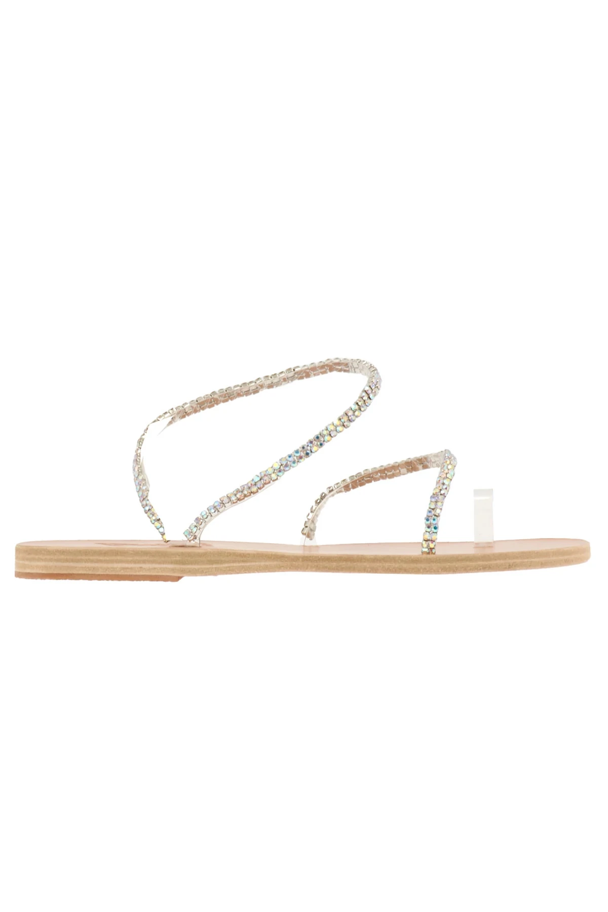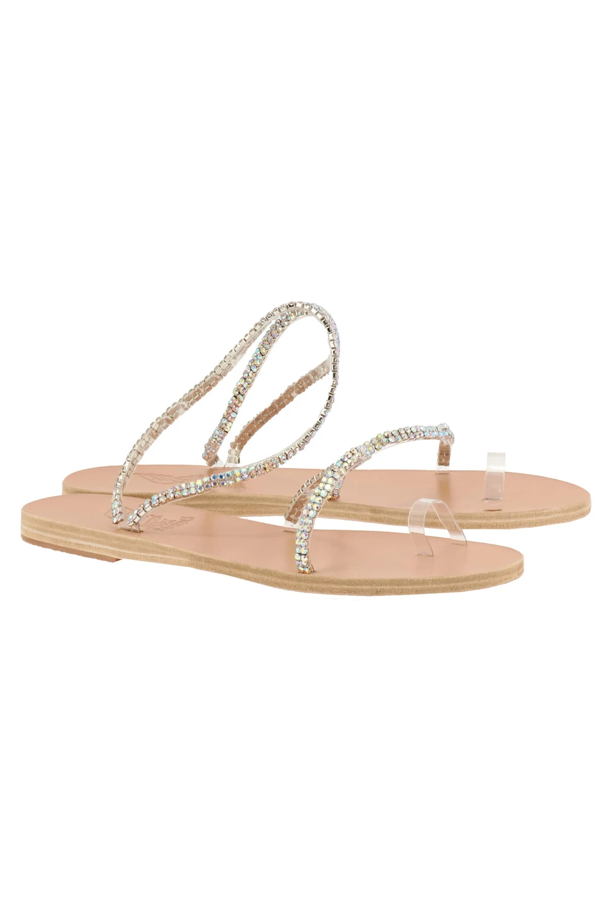 Irina sandals feature crystal ankle straps and a silicone toe strap with a flat footbed.