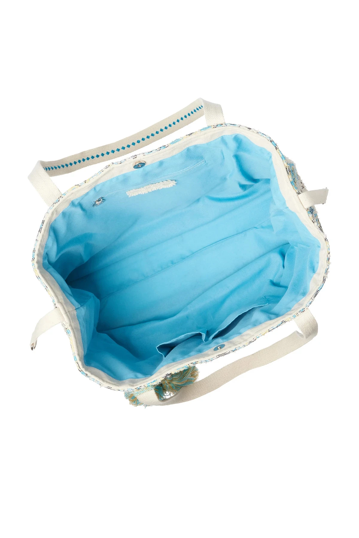 Aqua printed tote features a textured and printed fabrication offering double top handles with decorative tassels.