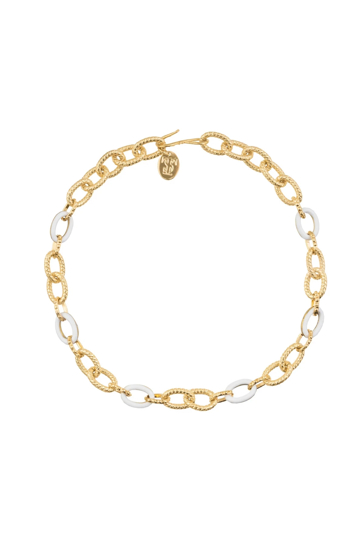 Necklace features thick chain links with white enamel accent links.