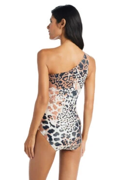 Avah high neck one piece swimsuit features sheer crochet insets with binding and diagonal seaming. Includes removable cups, and open back offers adjustable straps and moderate bottom coverage.
