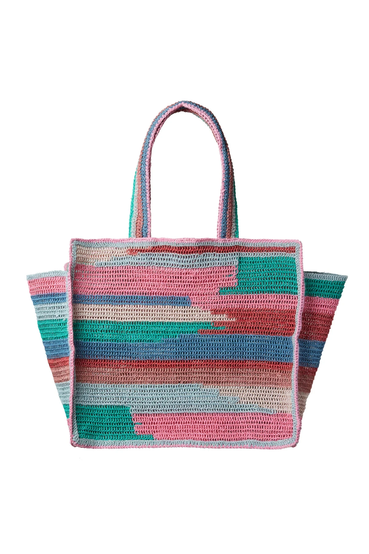 Avrejno is a multi colored hand crochet tote featuring all panel joining and edge finishing and offers double top handles.
