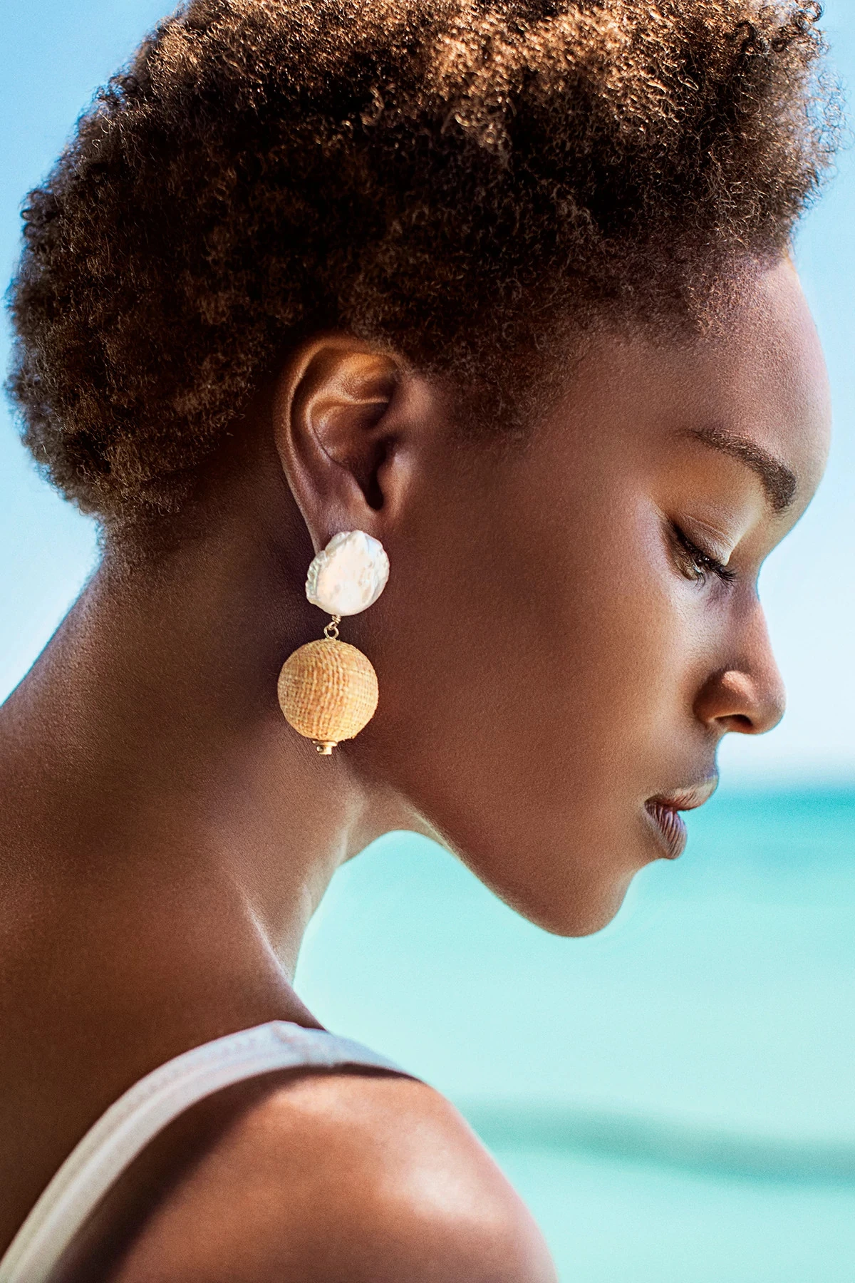 Woven raffia wrapped ball drop earrings featuring fresh water pearls and gold filled findings.