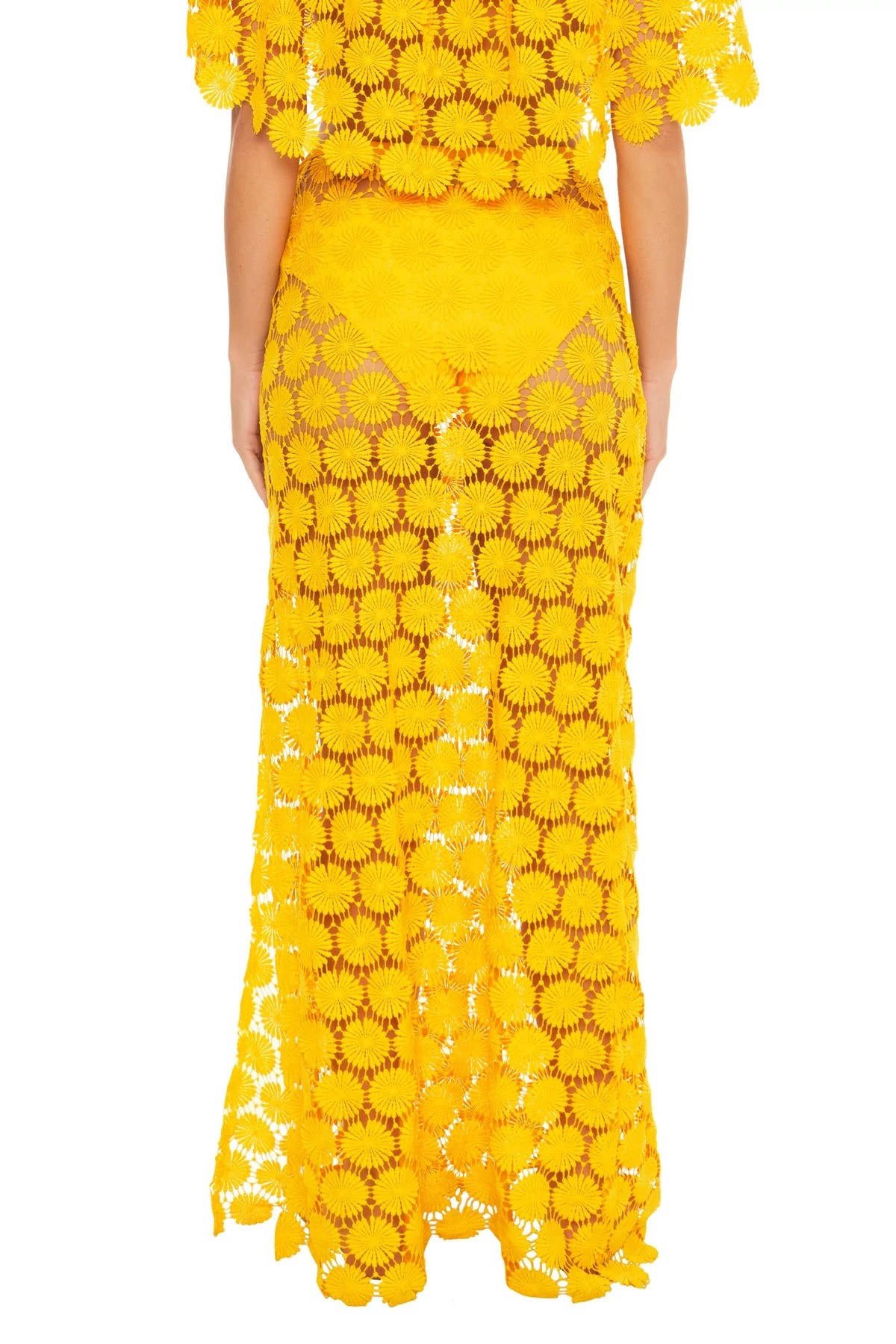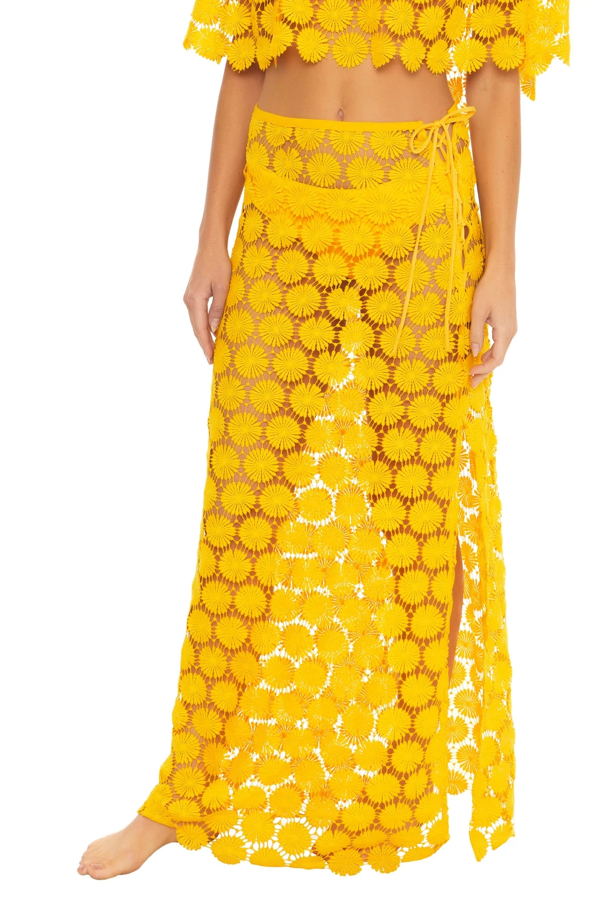 Bardot maxi skirt features an open weave crochet with a side slit and lace up ties at hip.