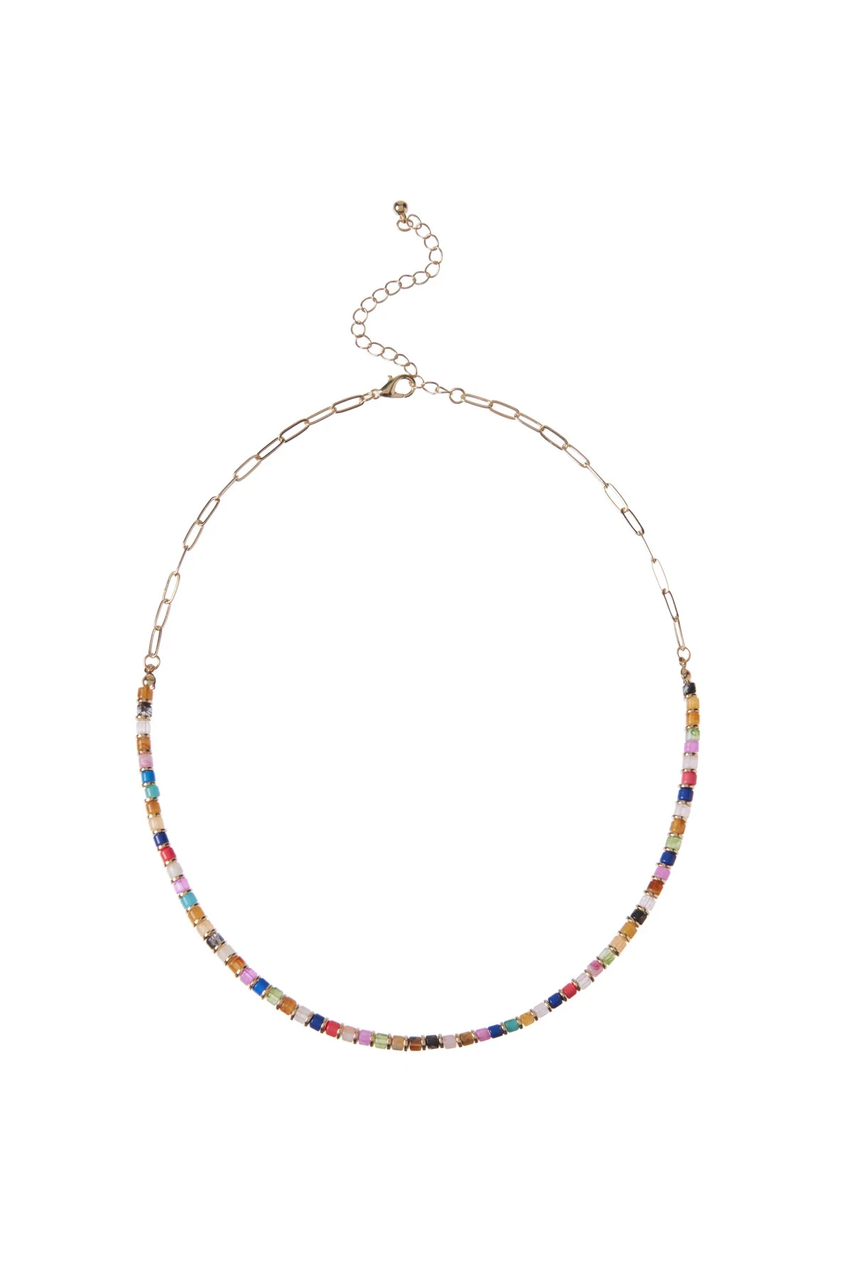 Necklace features a split chain with multi-colored stone beading and a cable chain that offers a lobster clasp closure.