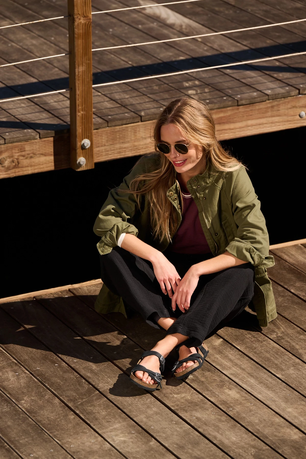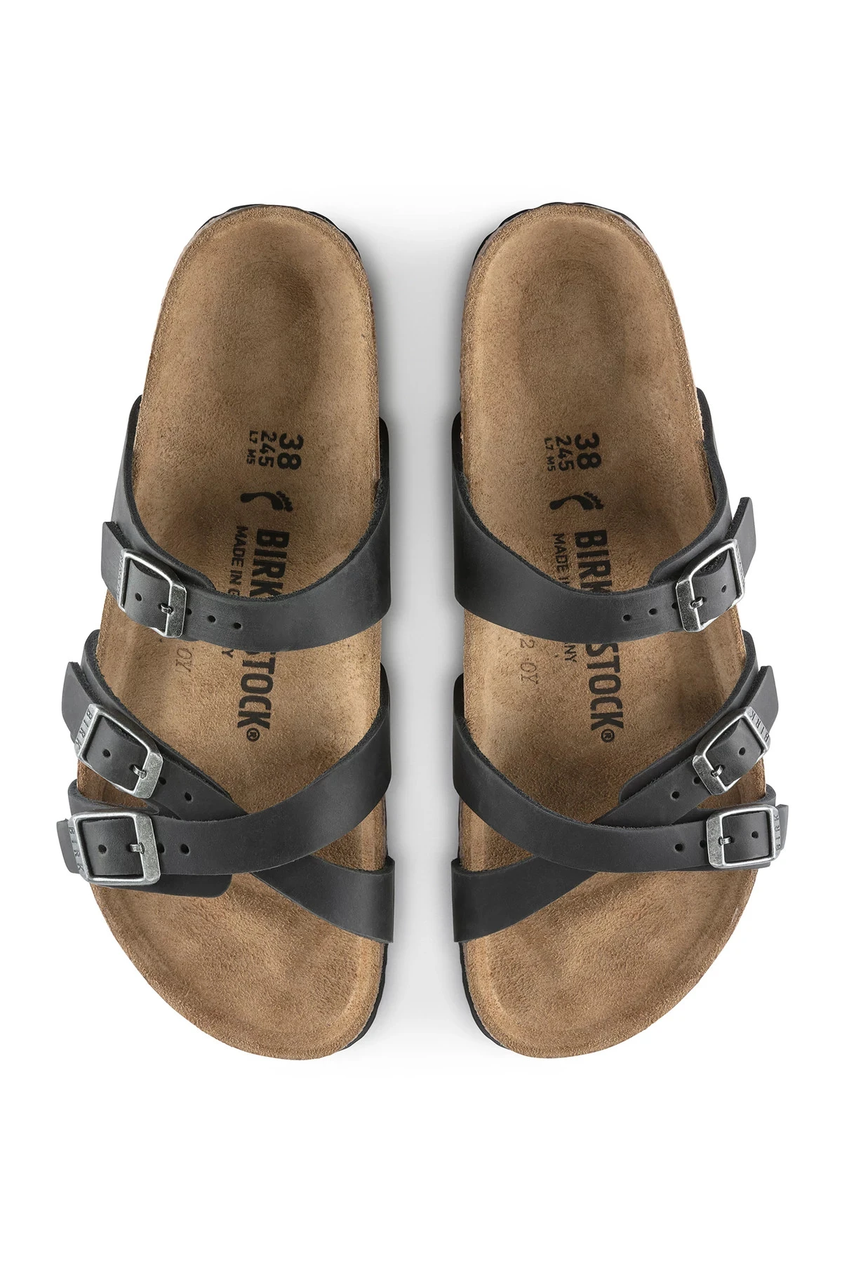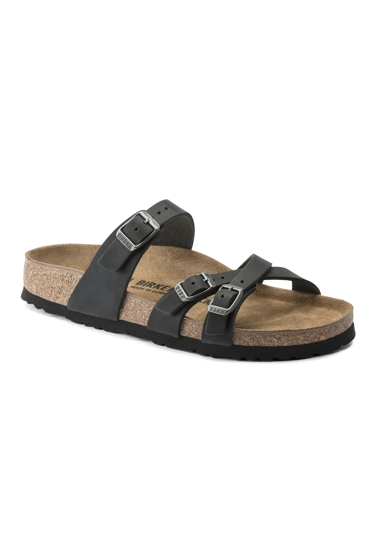 Franca oiled leather slides feature an anatomically shaped cork footbed with adjustable metal pin buckle straps.