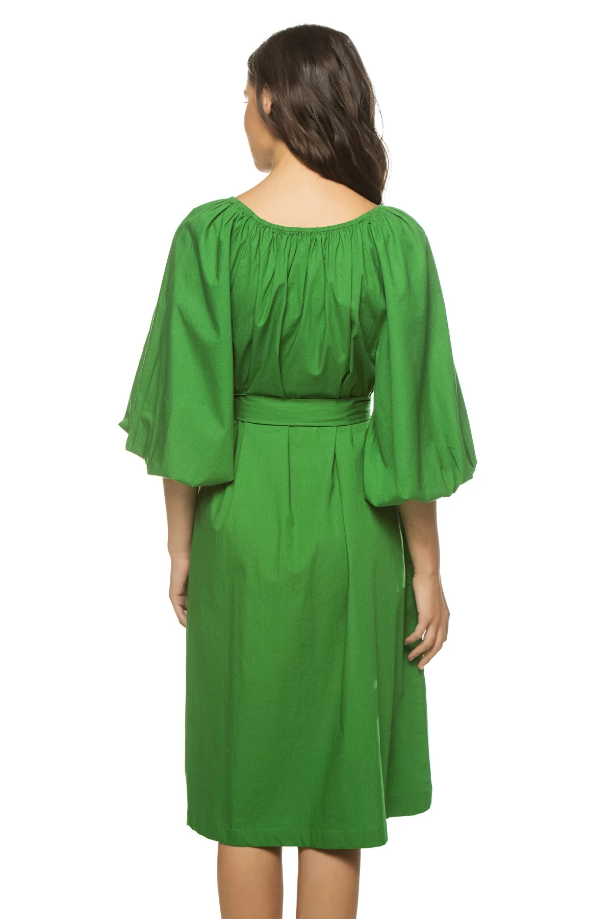 Bliss midi dress features balloon sleeves, elastic wrists and neckline, and an adjustable belted waist to match your preferred shape.