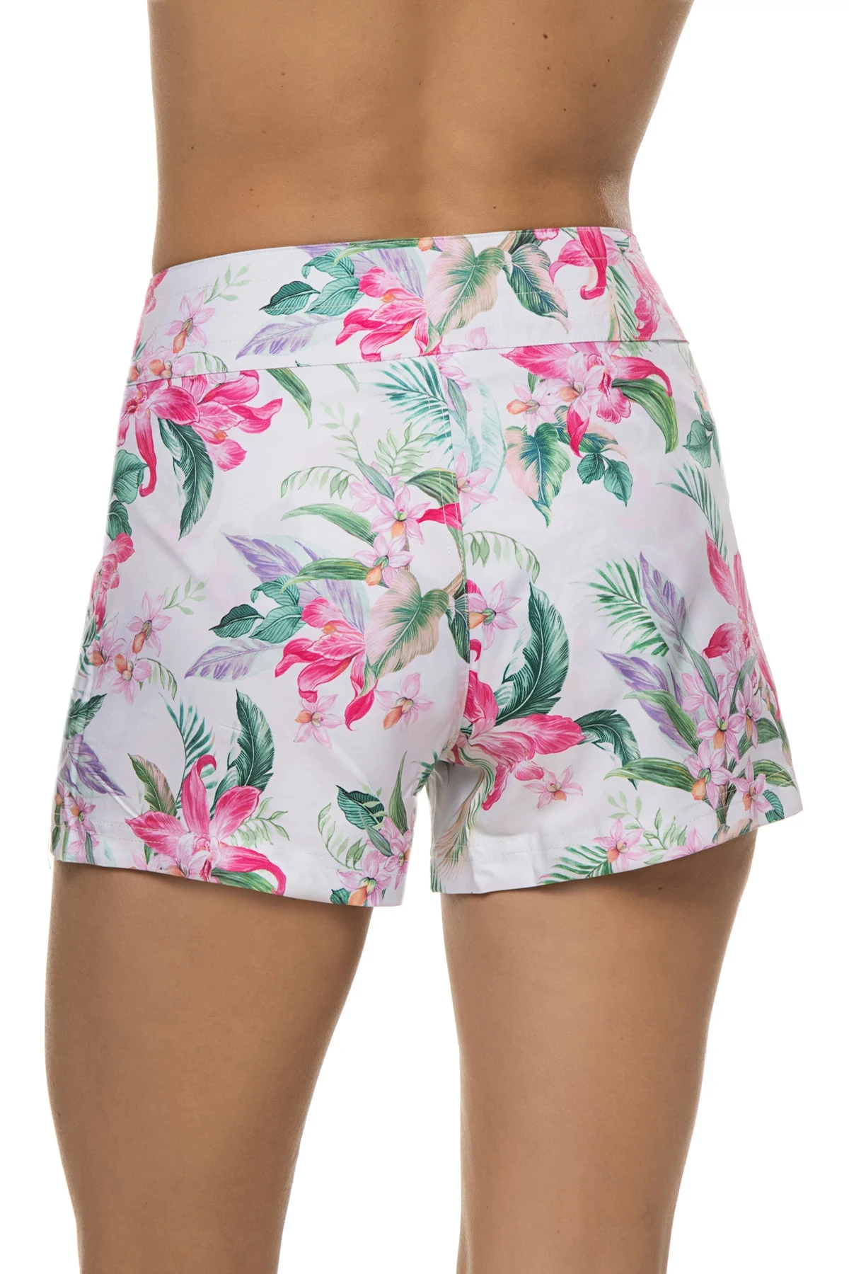 Boardshorts feature an elegant floral pattern with pockets and offers an adjustable tie waist.