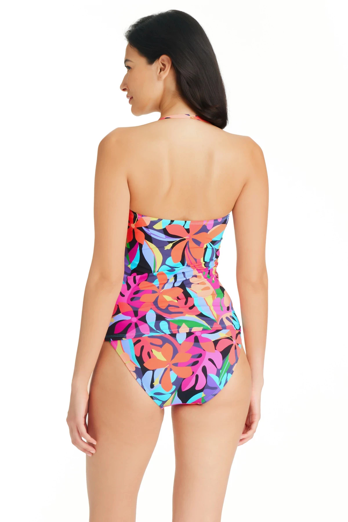 Tankini top features a vibrant tropical print and a draped bandeau bra with ring detail. Offers molded cups and a detachable halter strap with adjustable slider.