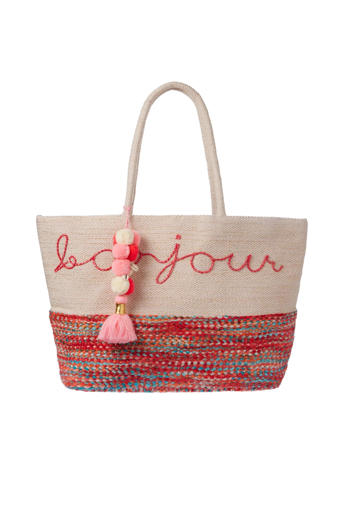 Tote features embroidered “Bonjour” graphic with pompom tassel accent and double top handles.