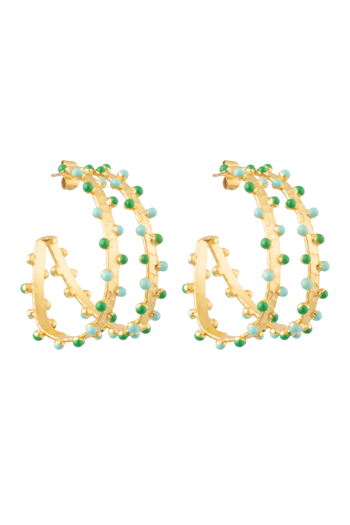 Boucles D’Oreilles Gipsy earrings are made from 22k gold plated brass adorned with turquoise and green enamel beads.