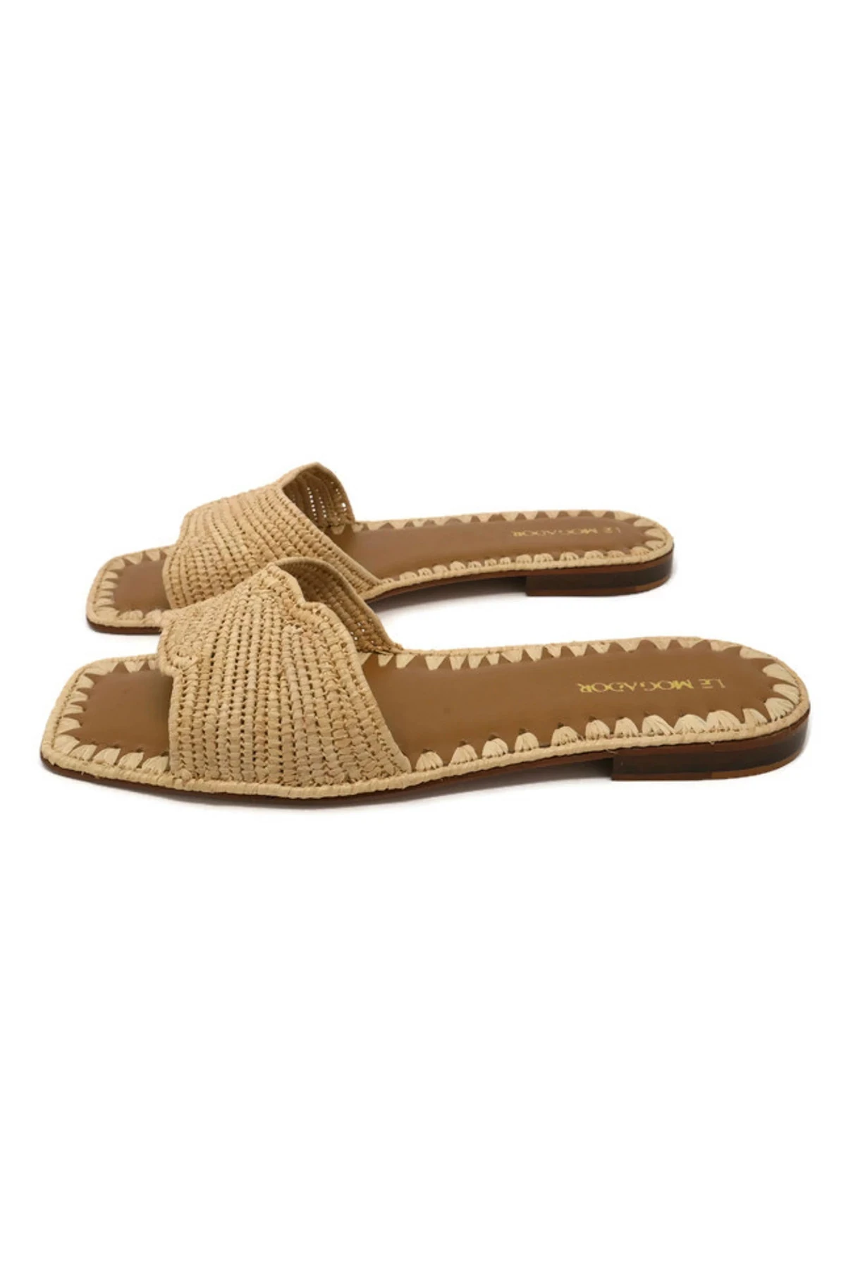 Slide features a braided raffia fabrication and offers a leather footbed.