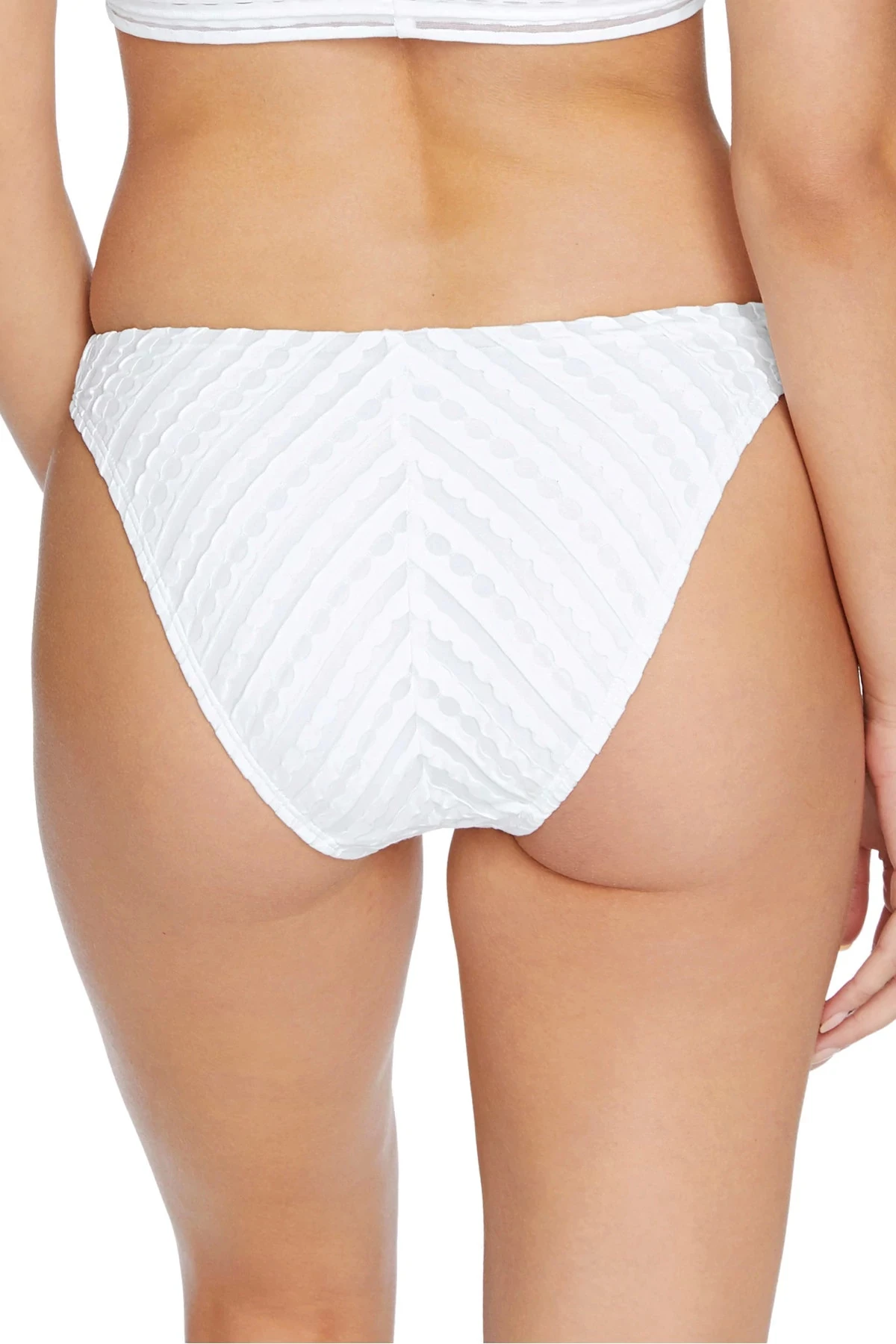 Brazilian bikini bottom features a textured fabric and offers a cheeky bottom and minimal coverage.