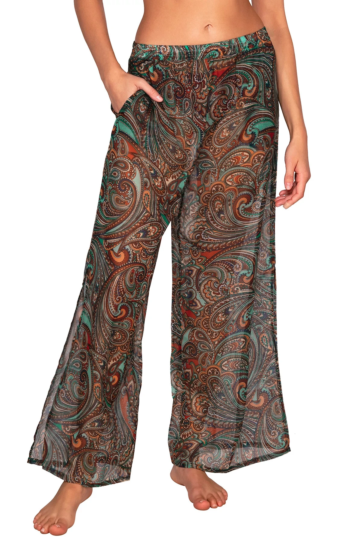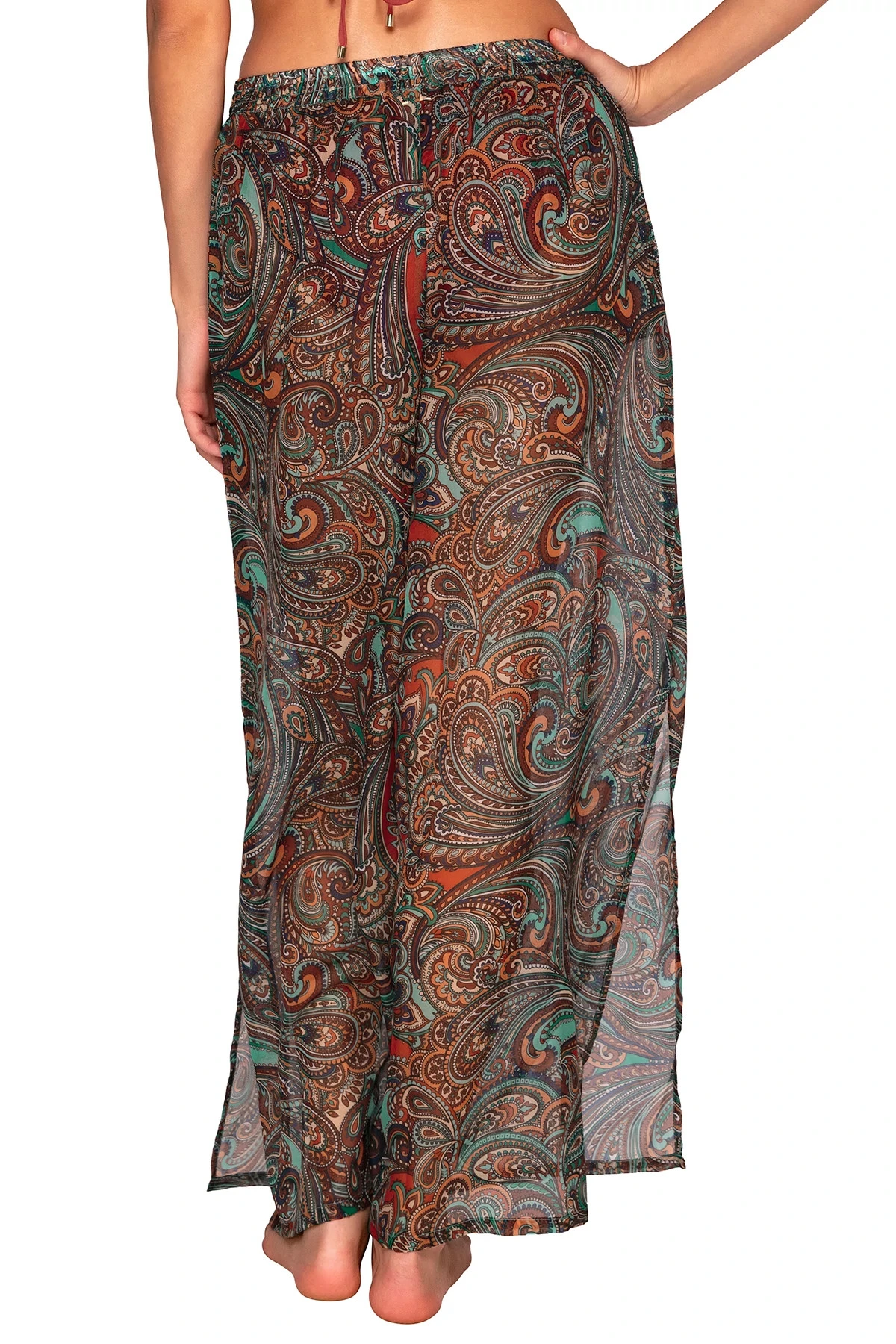 The Breezy Beach Pant is loose-fitting and secured with a soft elastic waistband. It features a wide leg silhouette with slits on the sides for a more festive vibe.