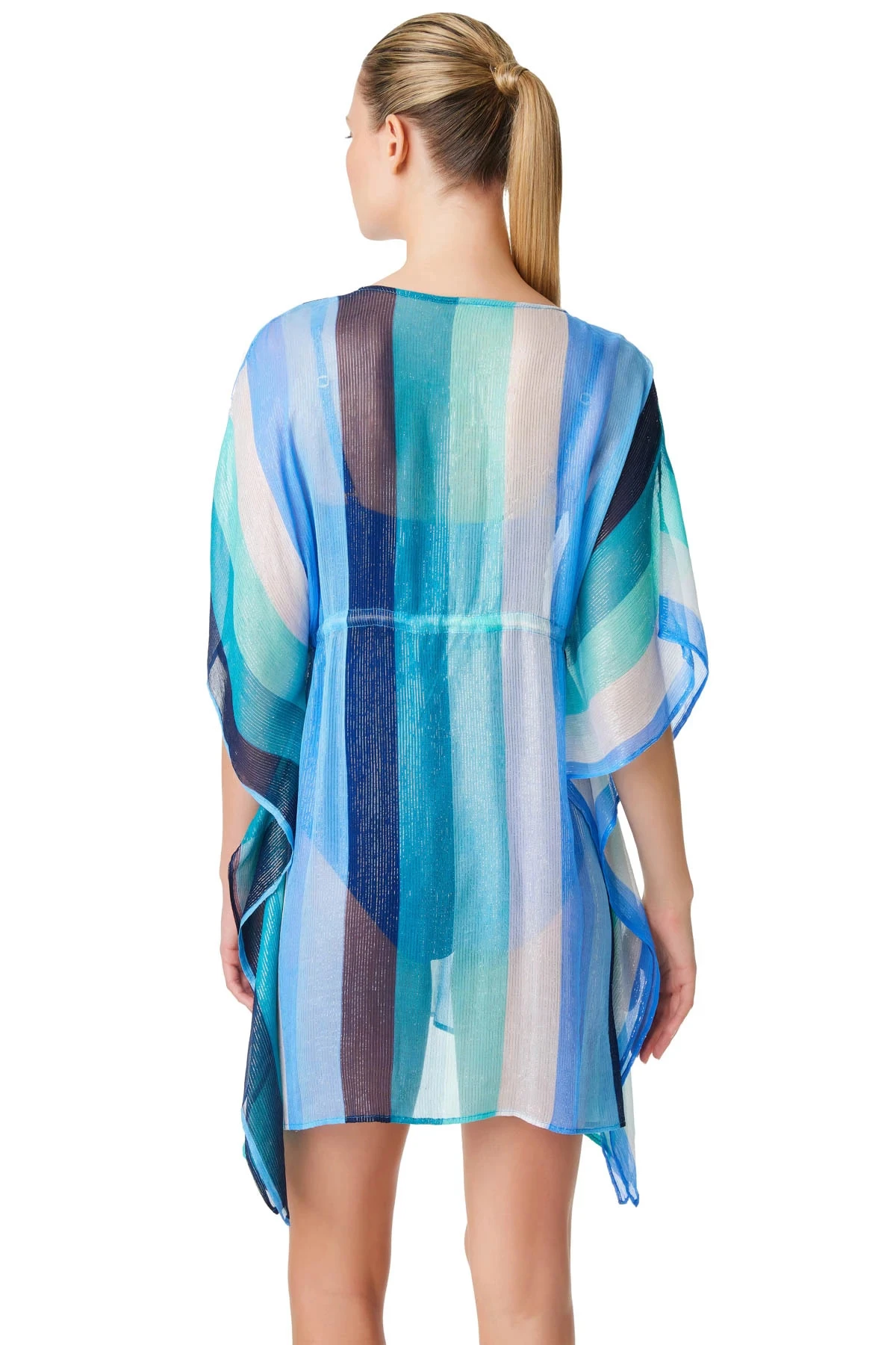 Tunic features a deep v-neckline with thin adjustable ties at center front and open flowing butterfly sleeves.