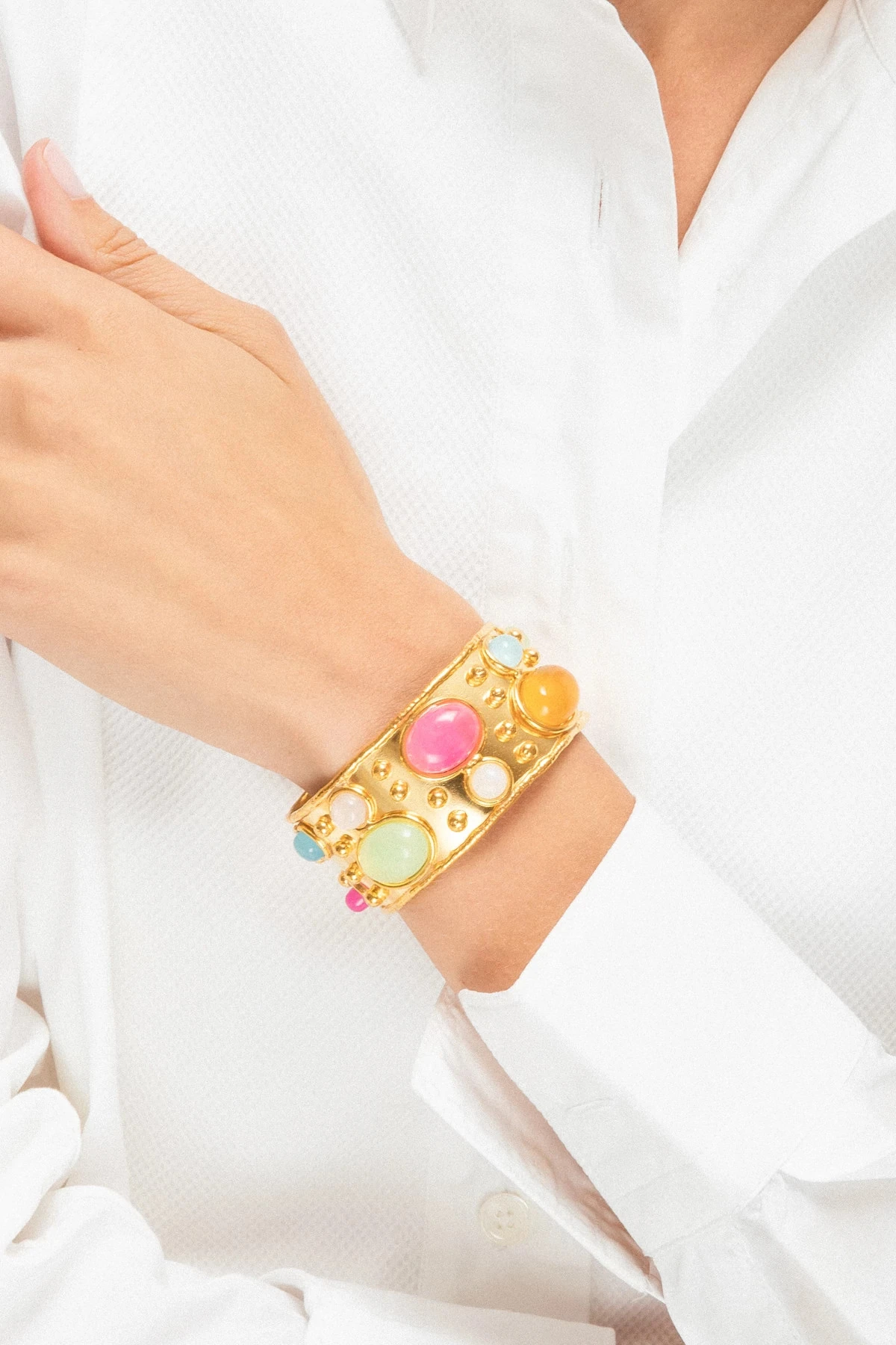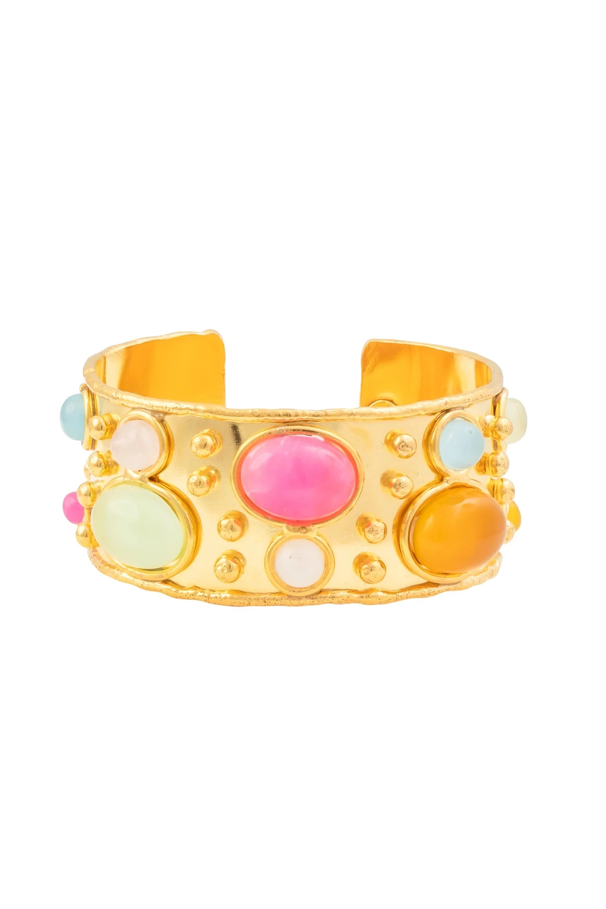 Byzantine cuff is a beautifully hand-crafted 22k yellow gold-plated brass slip-on cuff featuring multi-colored gemstones and a logo-stamped interior.