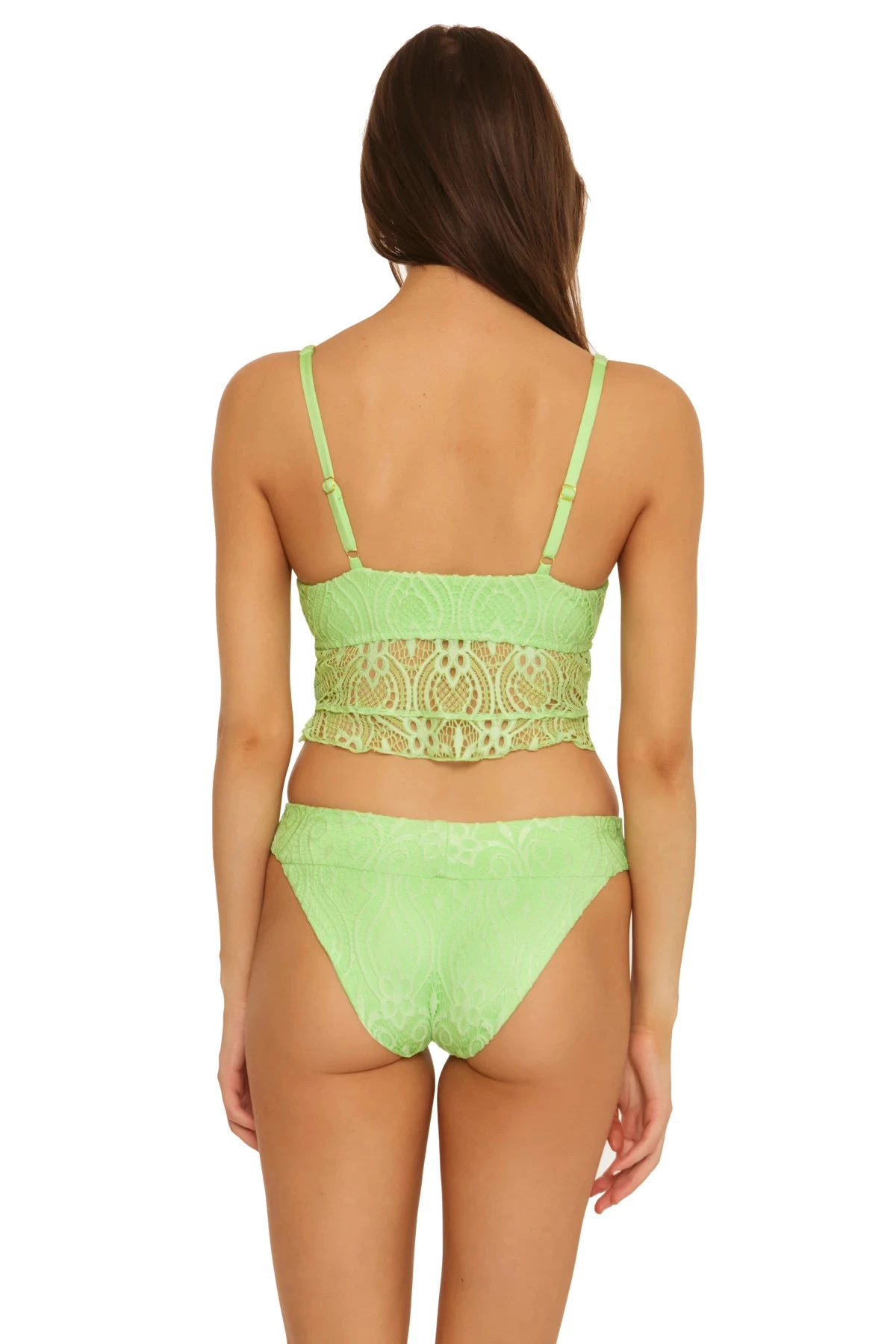 Bralette bikini top features a lace bodice with removable cups and offers adjustable shoulder straps with a pull over fit.