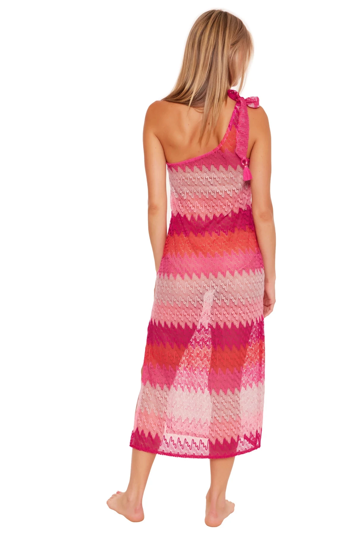 Crochet dress features side slits and an asymmetrical neckline with a textured ring connector that offers an adjustable tassel tie.