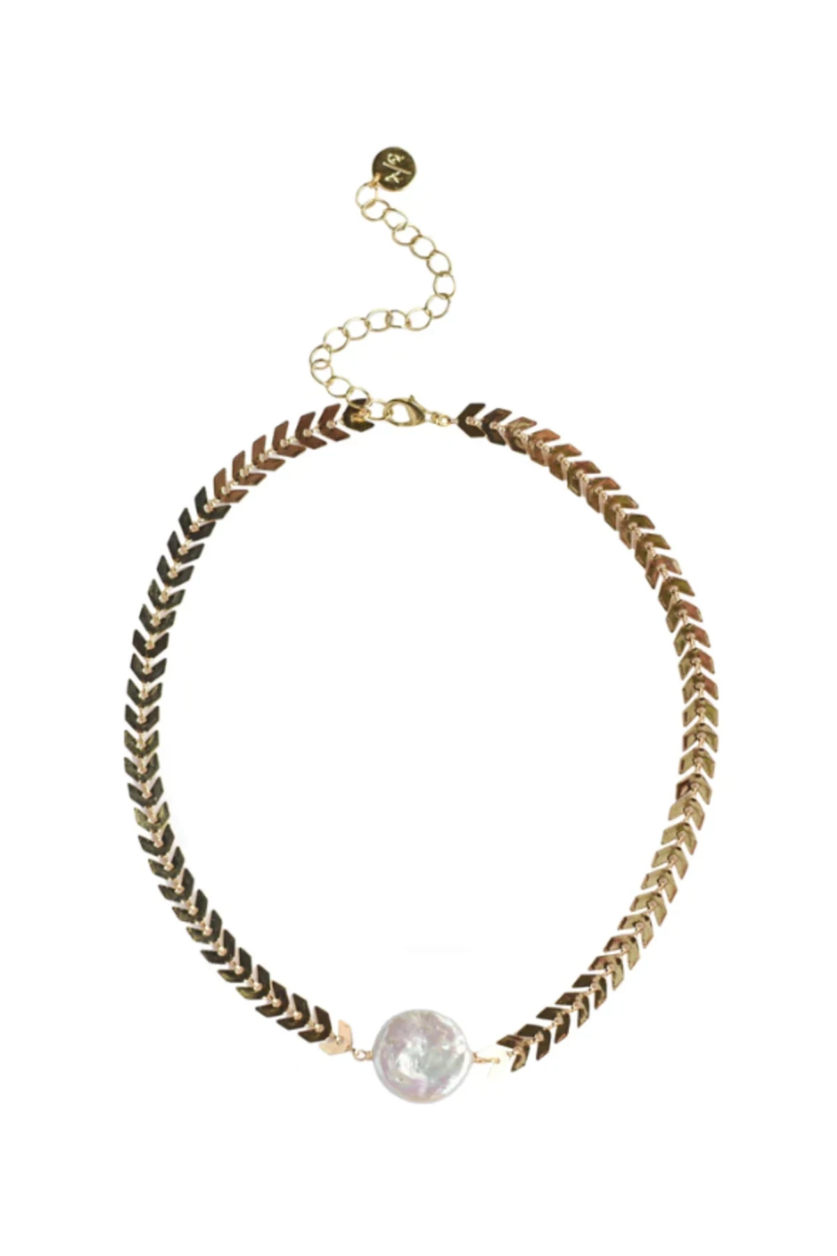 So sleek, so chic! This is our go-to choker, we just love this unique chevron chain. Freshwater pearl. Natural materials, size and shape may vary. Handmade (with good vibes) in the USA, to order. 14k gold plated brass chain and is approx. 13.5″-15.5″ adjustable.