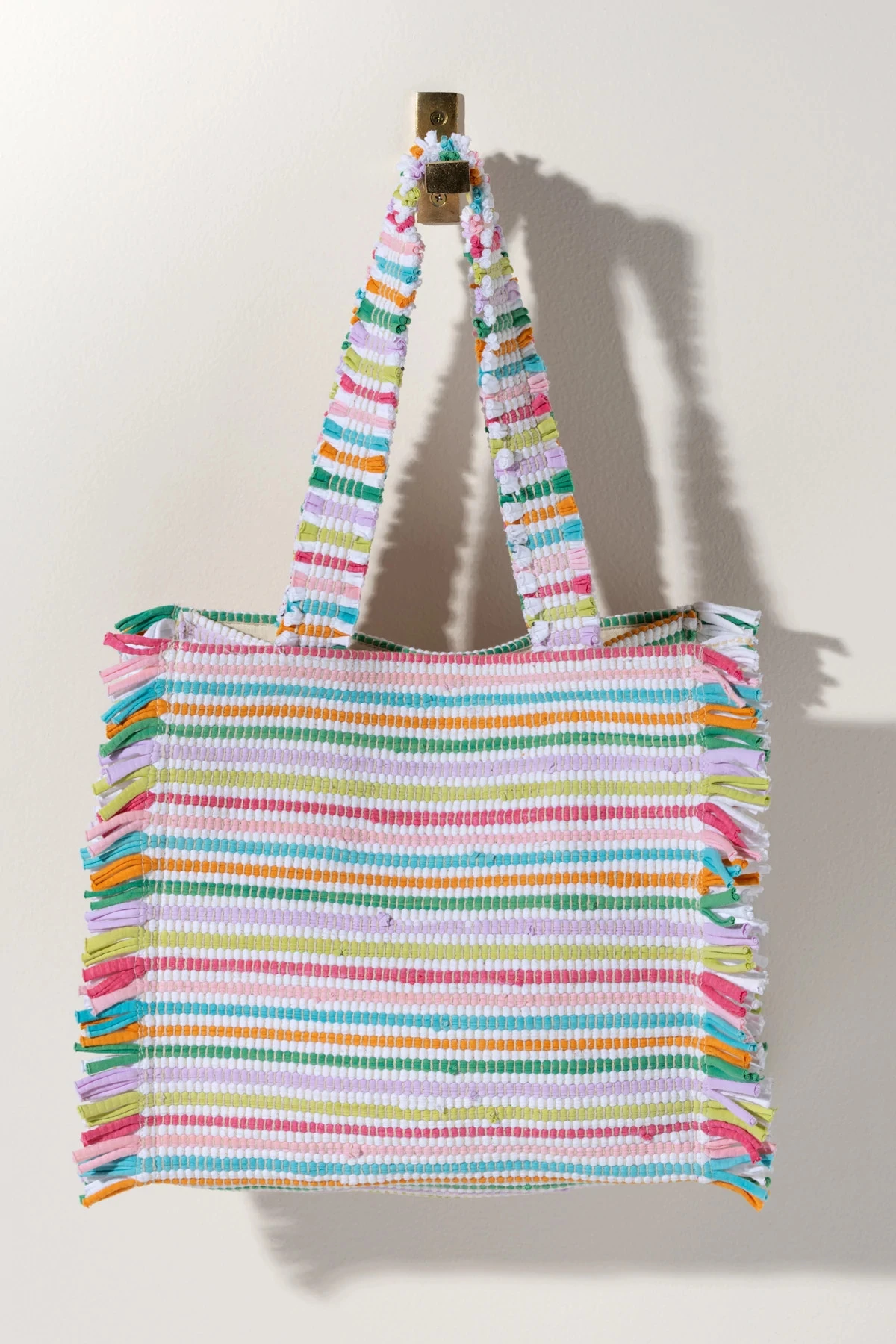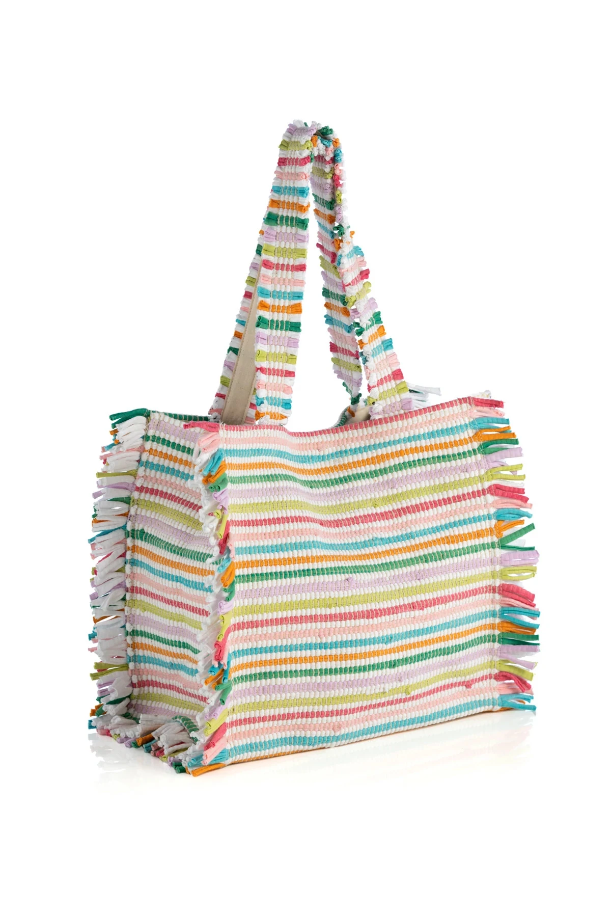 Chiara fringe tote features a rainbow stripe pattern with a fringe trim and offers double top handles.