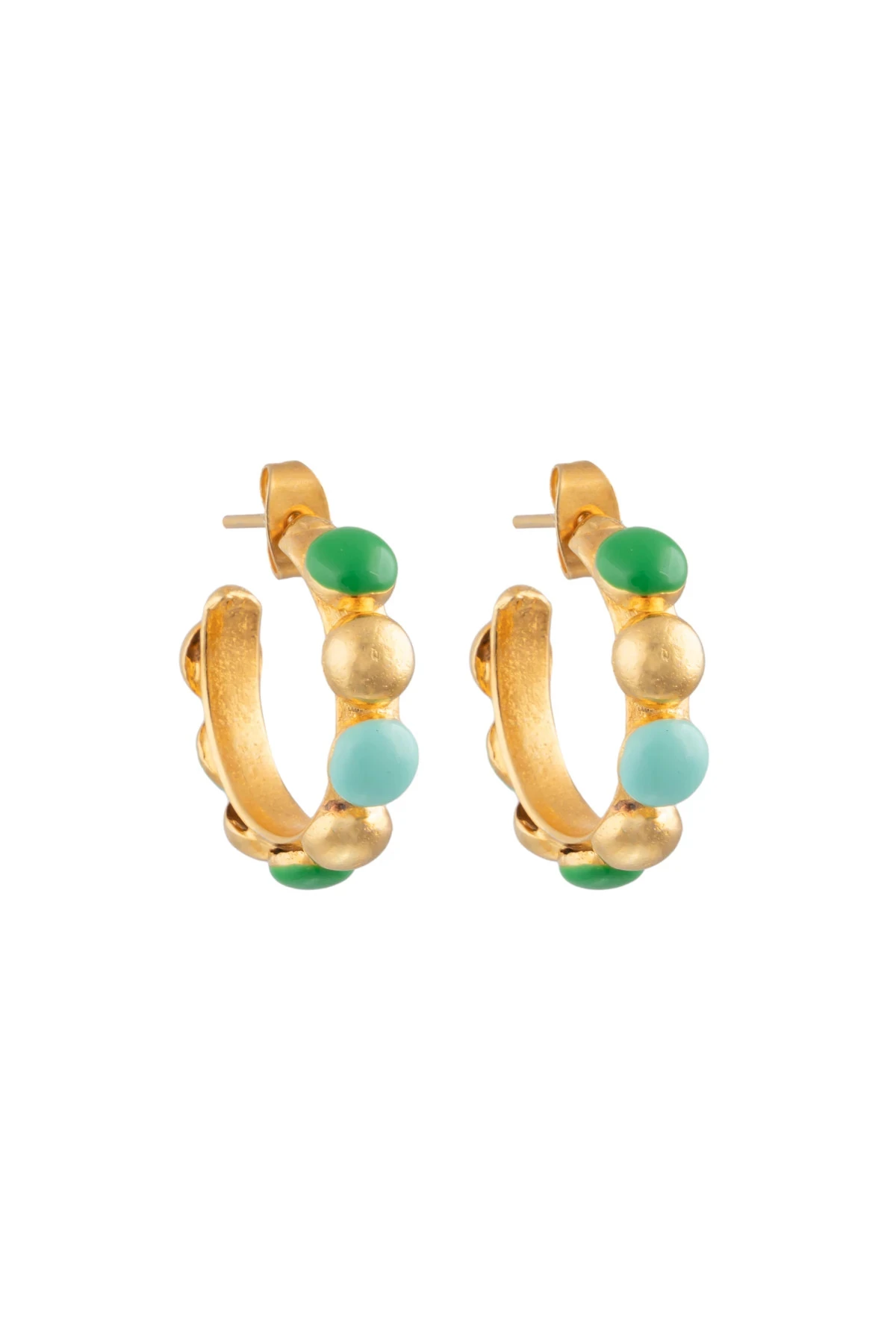Creole mini hoop earrings feature hand-crafted 22k gold-plated brass accentuated with multi colored gemstones with post back closures.