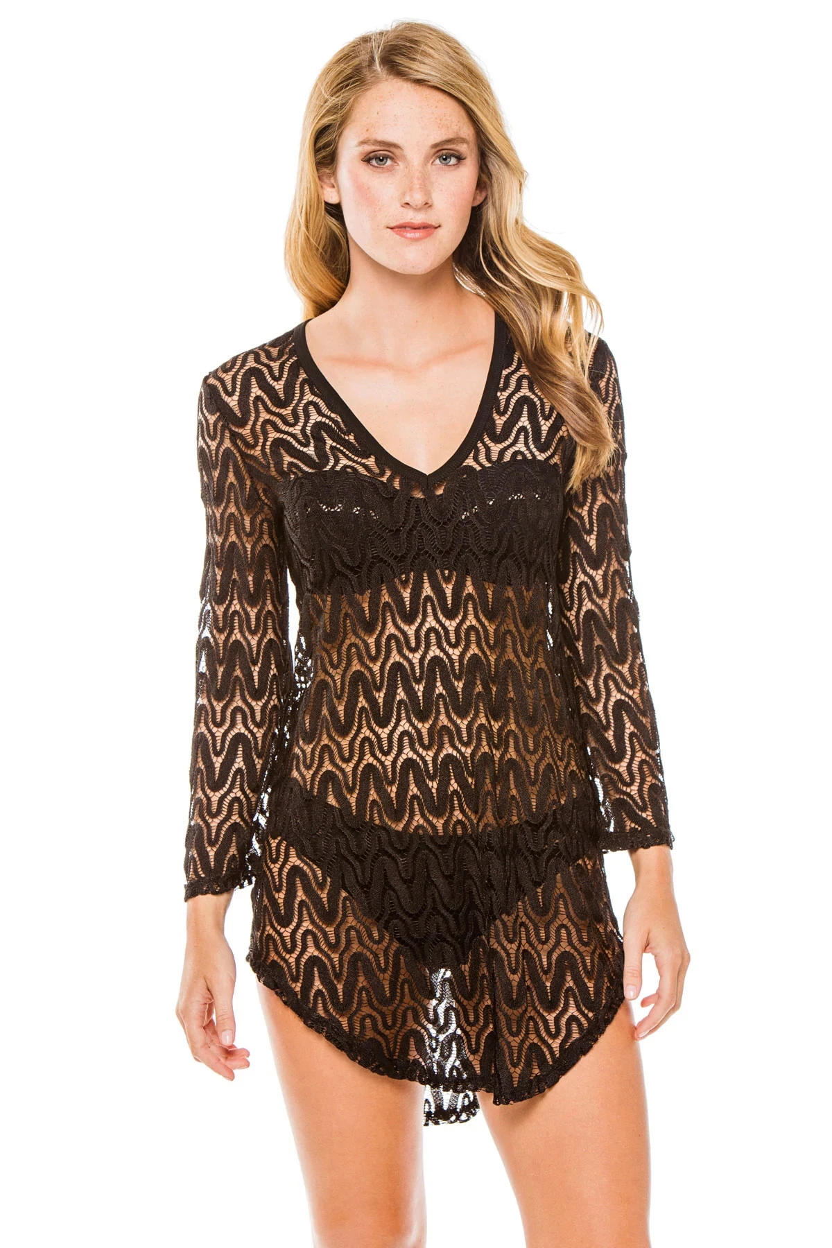V-neck crochet tunic with bell sleeves and A-line silhouette.