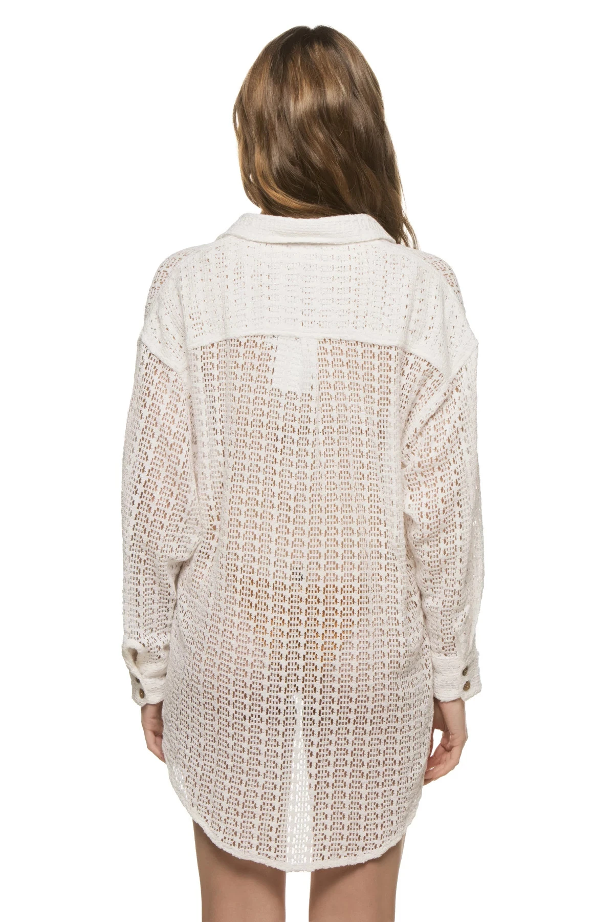 Shirt dress features a cotton crochet fabrication with a collared neckline and button-up closure.