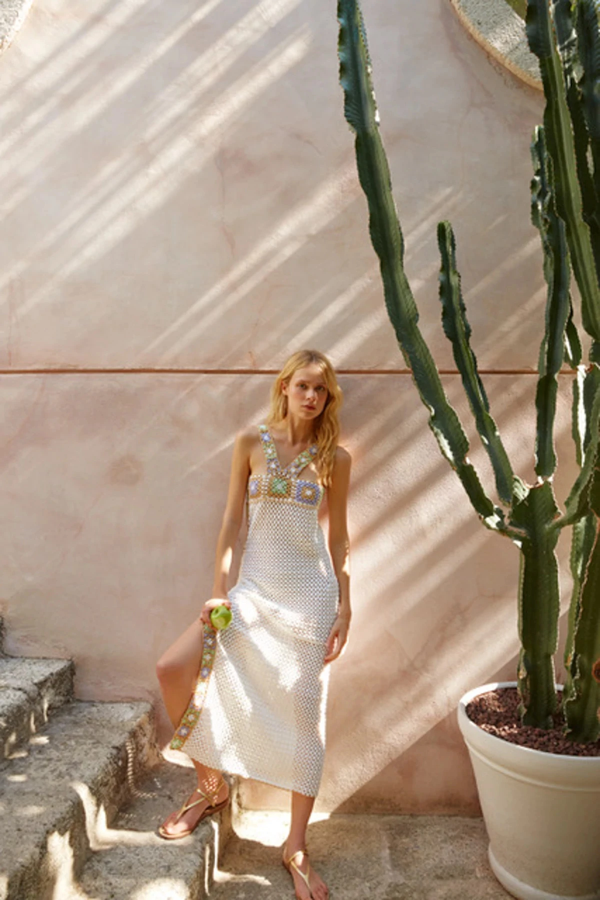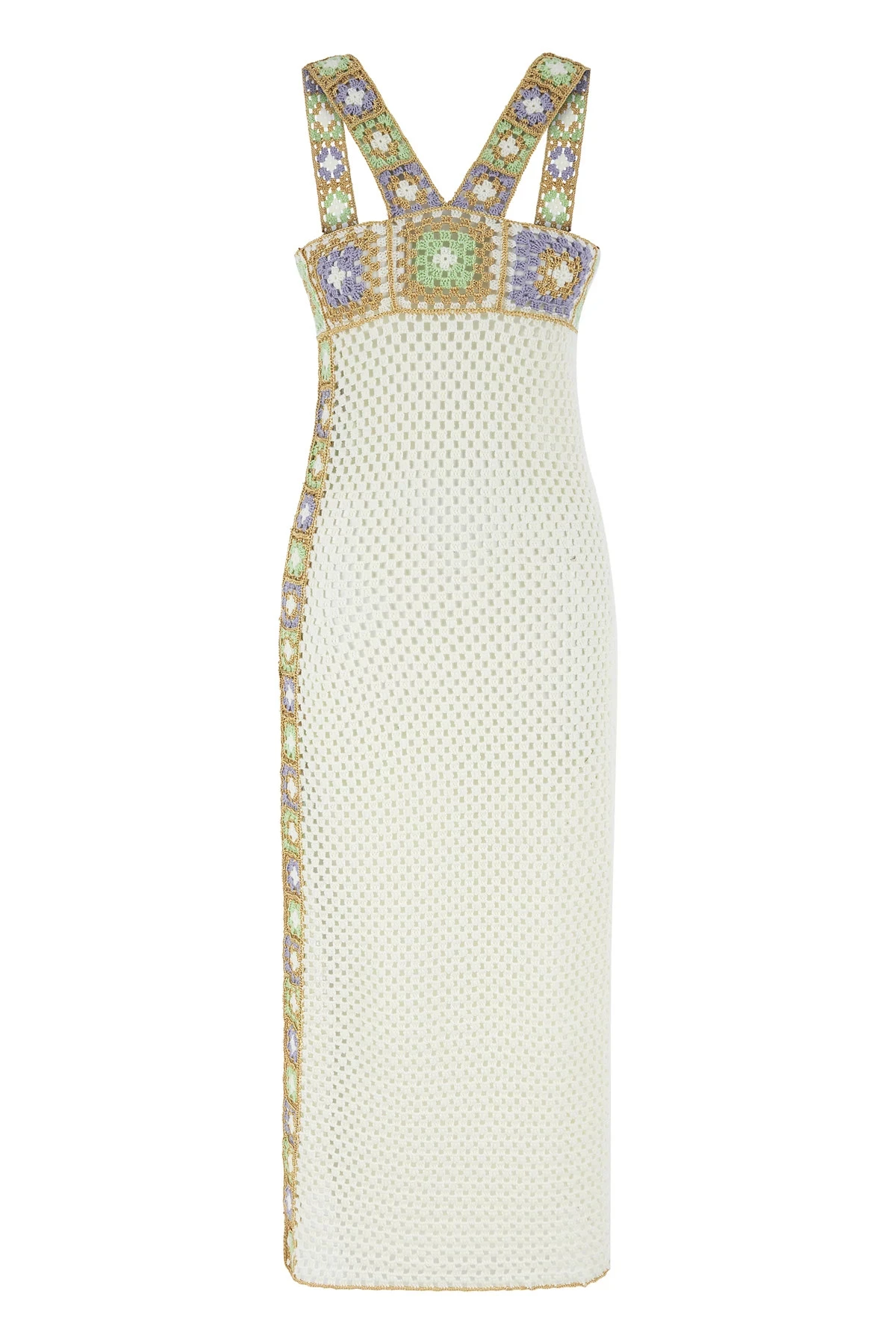 Midi dress features an open weave crochet knit with patchwork detail, a side slit and fixed high neck straps.