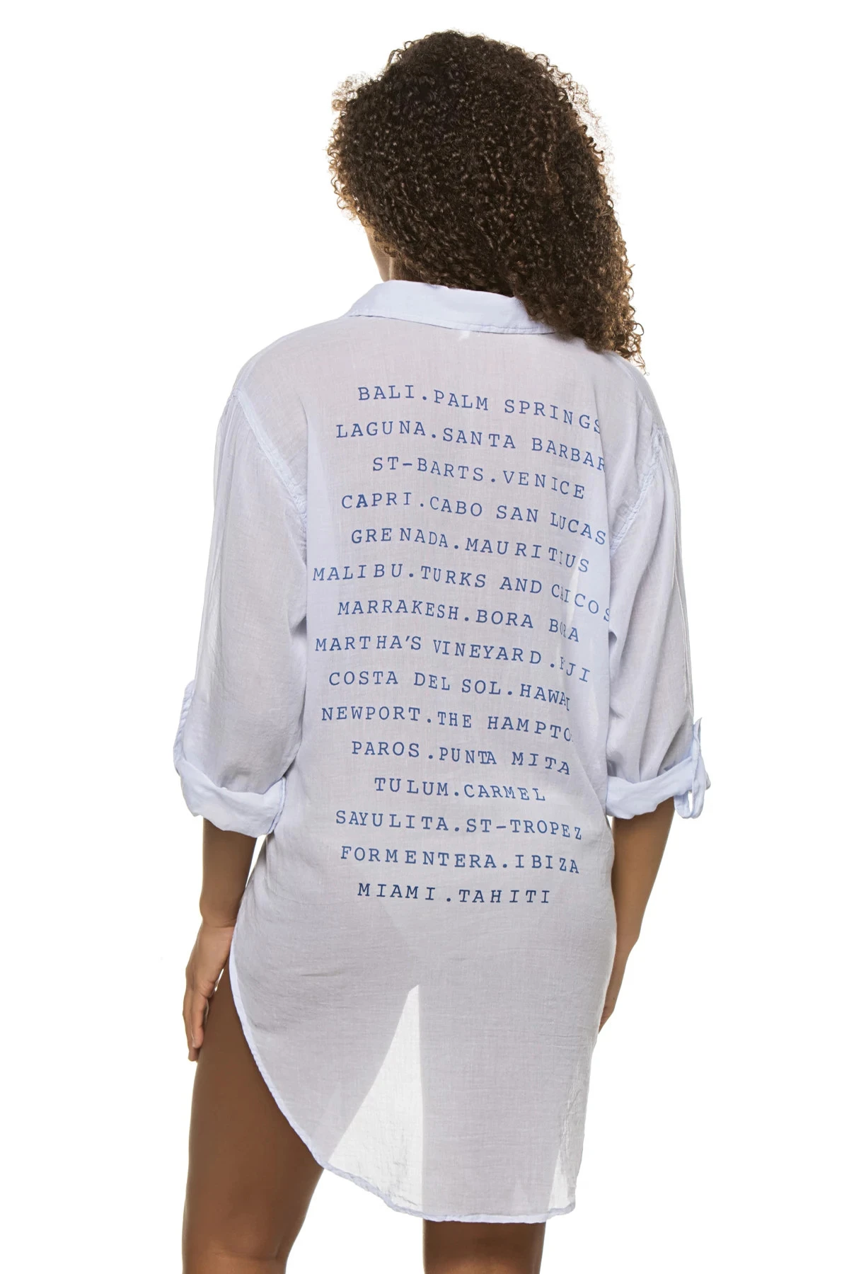 Destinations oversize shirt dress features a collared neckline with back graphics and offers button up sleeves and a button up closure.