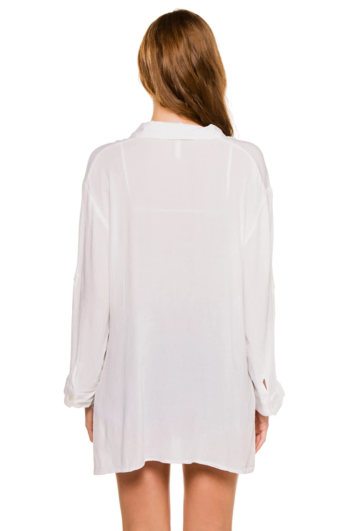 Shirt dress features a collared neckline with long loose fitting sleeves and a button down front with side slits.