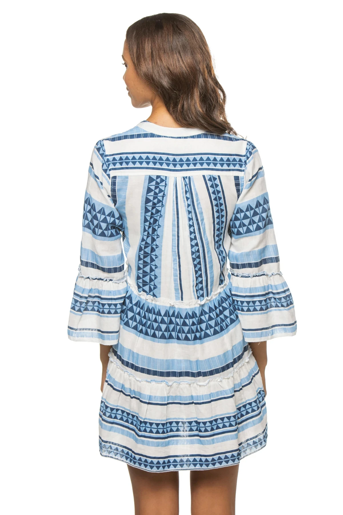 Tunic mini dress features a geometric pattern with a flowy a-line silhouette and offers 3/4 sleeves and a tiered skirt.