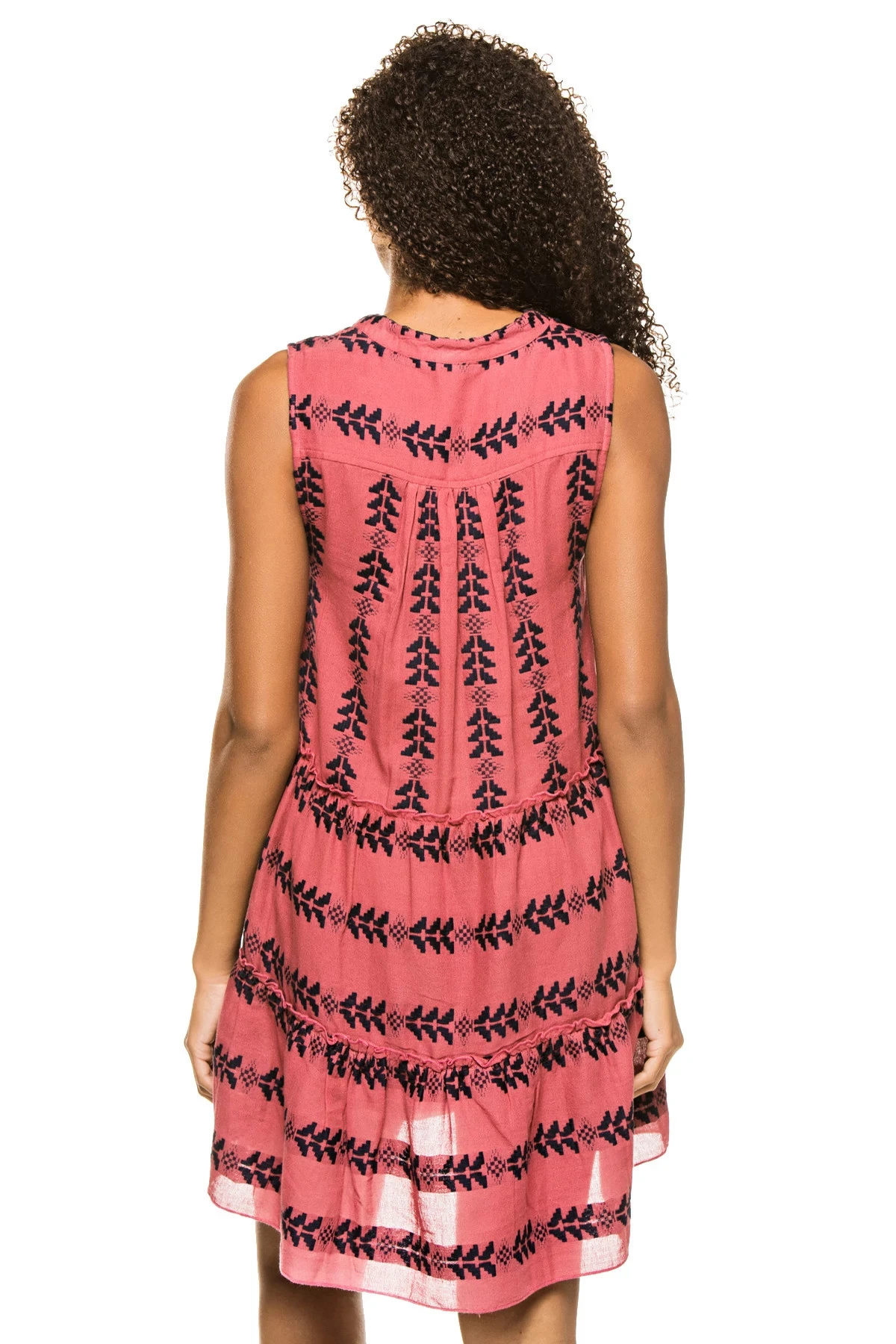 Short A-Line dress features a high v-neckline and ruffle tiers.
