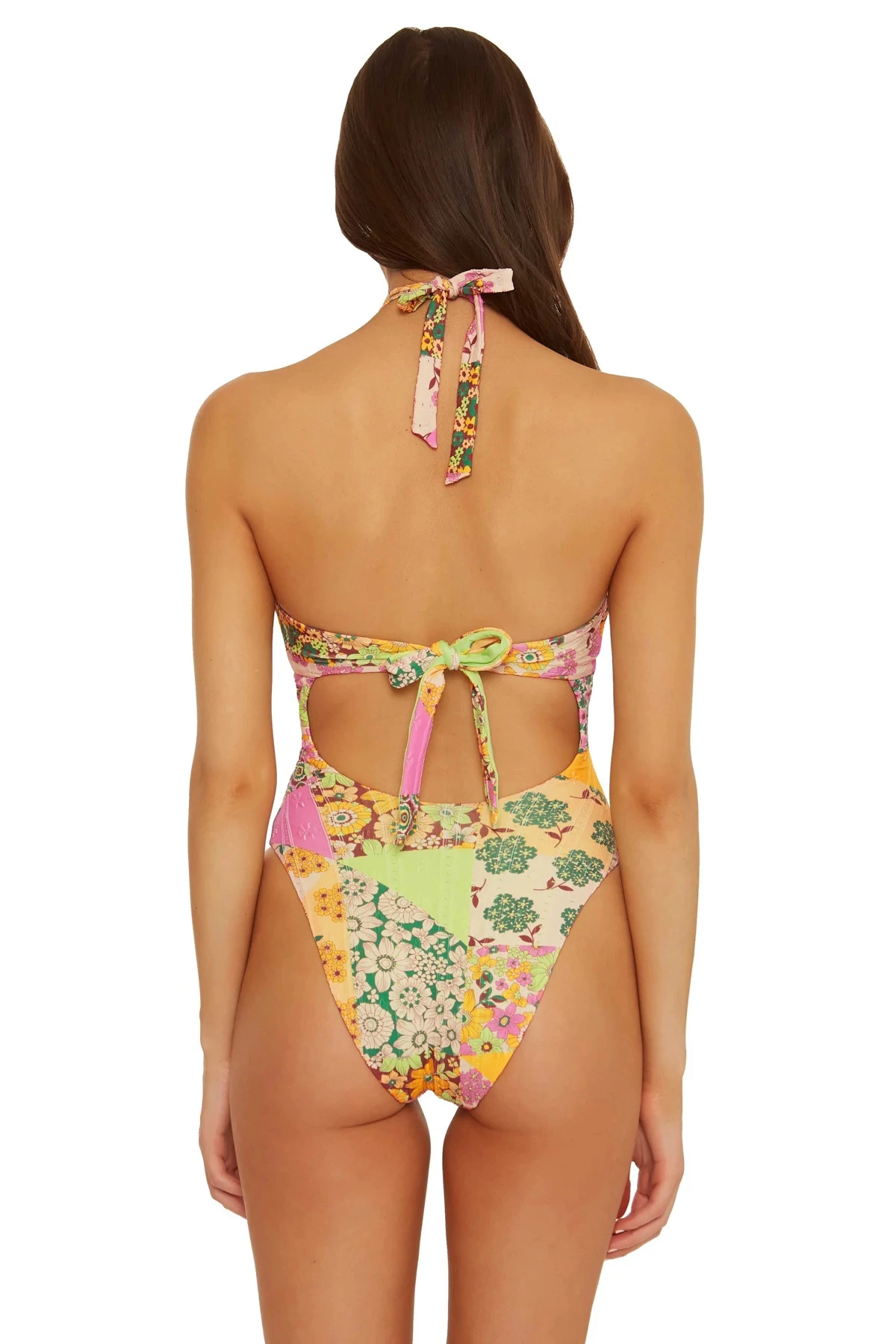Embrace one piece swimsuit features a ditsy floral print with a high neckline and plunge cutout. Offers removable soft cups, adjustable straps, and skimpy bottom coverage.
