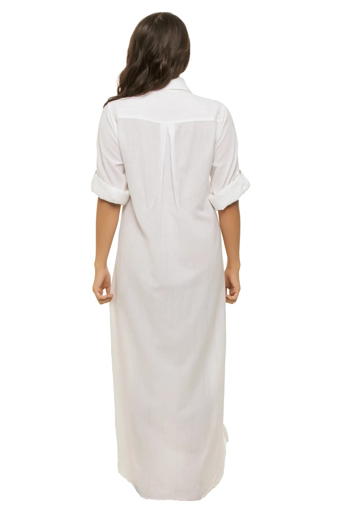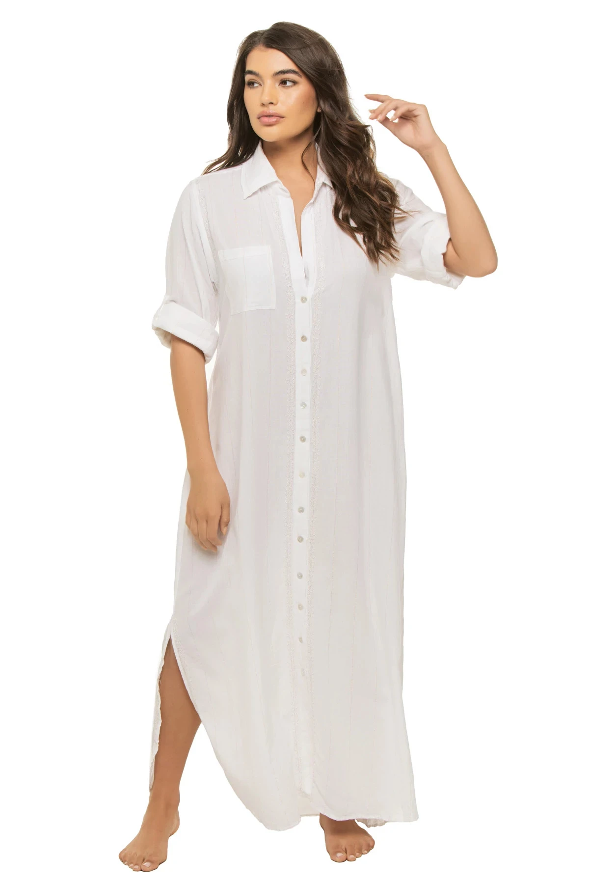 Maxi boyfriend shirt features intricately embroidered details with long sleeves and a collared neckline. Offers a button up closure and side seam slits.