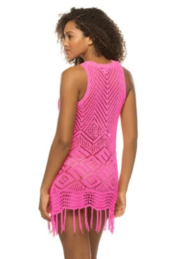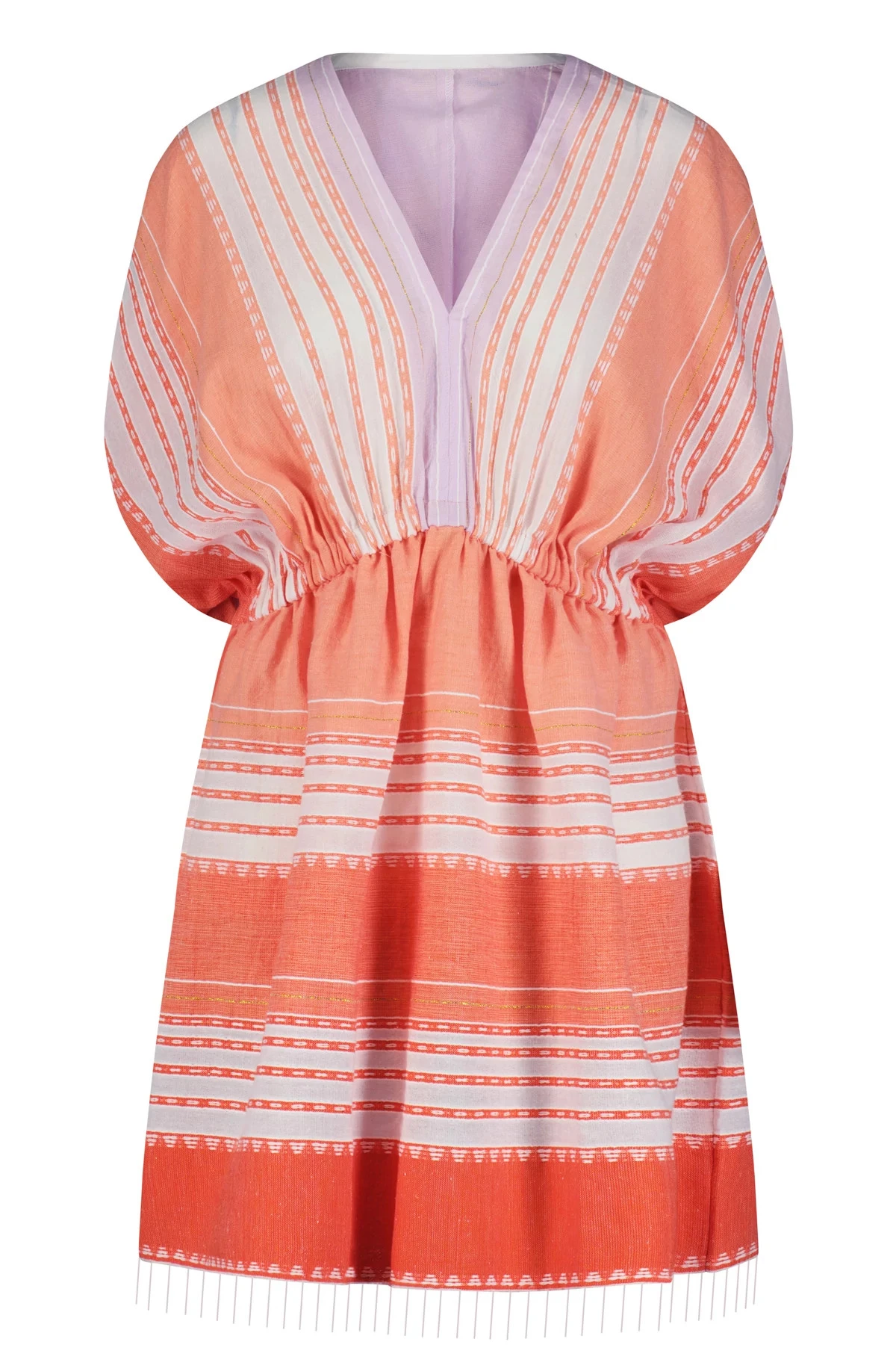 Eshal mini dress features a delicate weave of white dots and dashes with gold lurex threading made by the most skilled artisans. Offers deep v-neckline, an elastic waist and raw fringe hem.