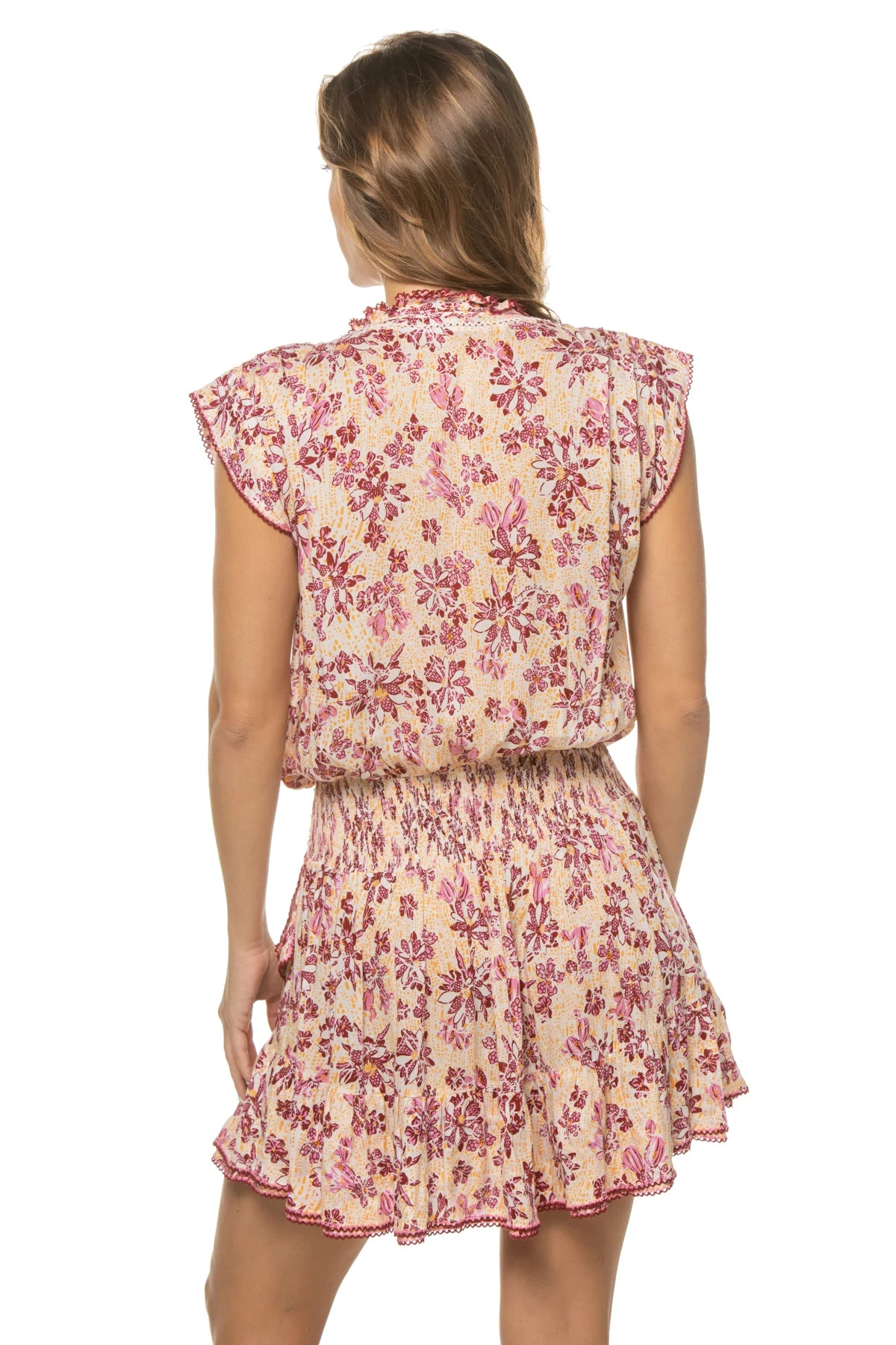 Estelle mini dress features a v-neckline with square cut sleeves and a wrap effect skirt finished with flirty ruffles and a smocked back waist.