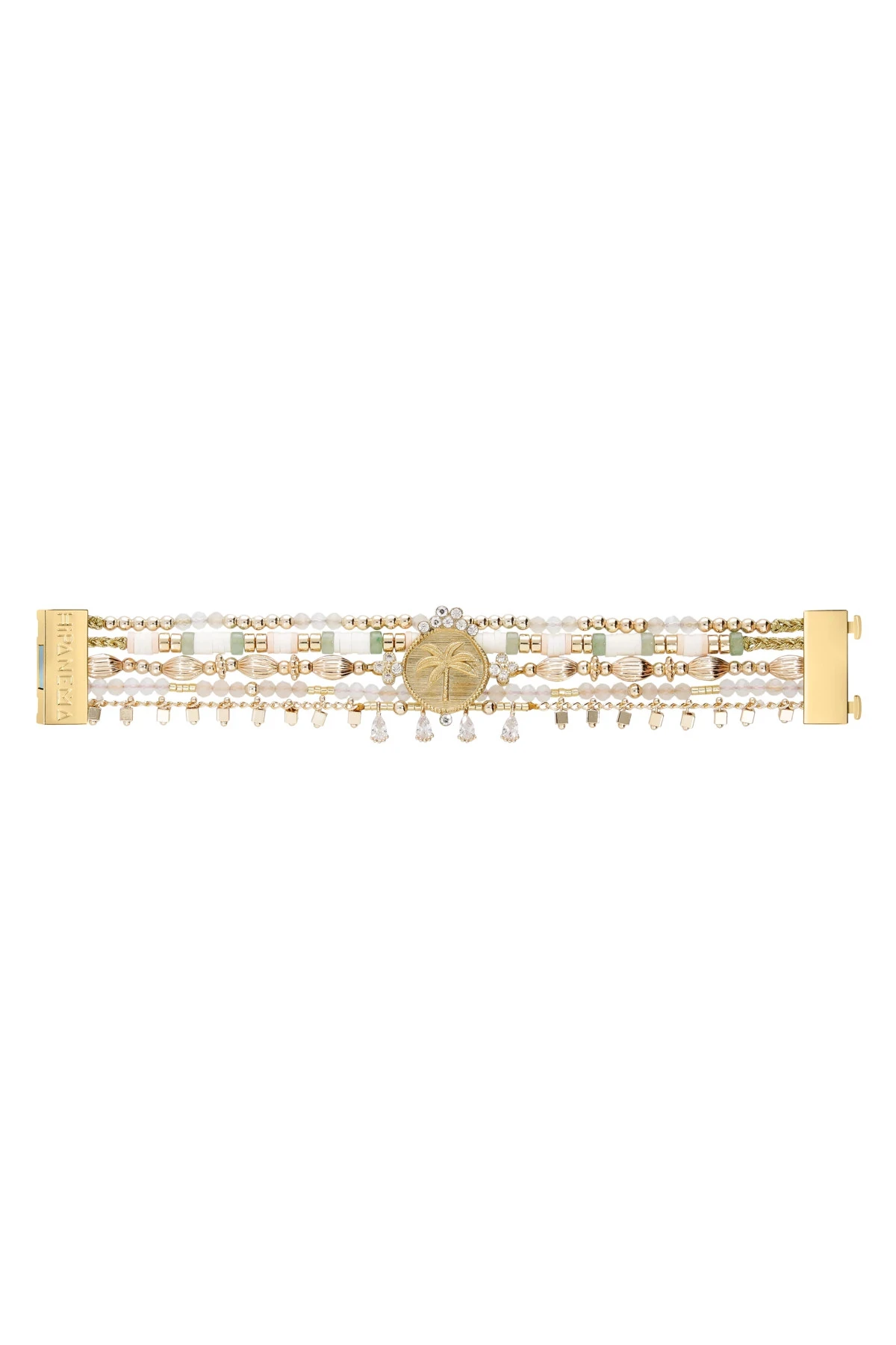 Exotic bracelet features five stacked bracelets with gold and crystal beads and offers a magnetic clasp closure.