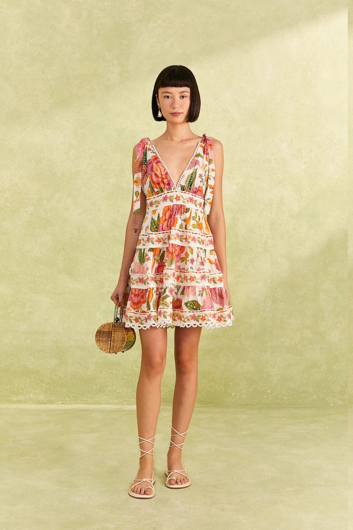 Macaw bloom mini dress features an elegant floral print with a crochet detailed hem and offers adjustable tie straps.