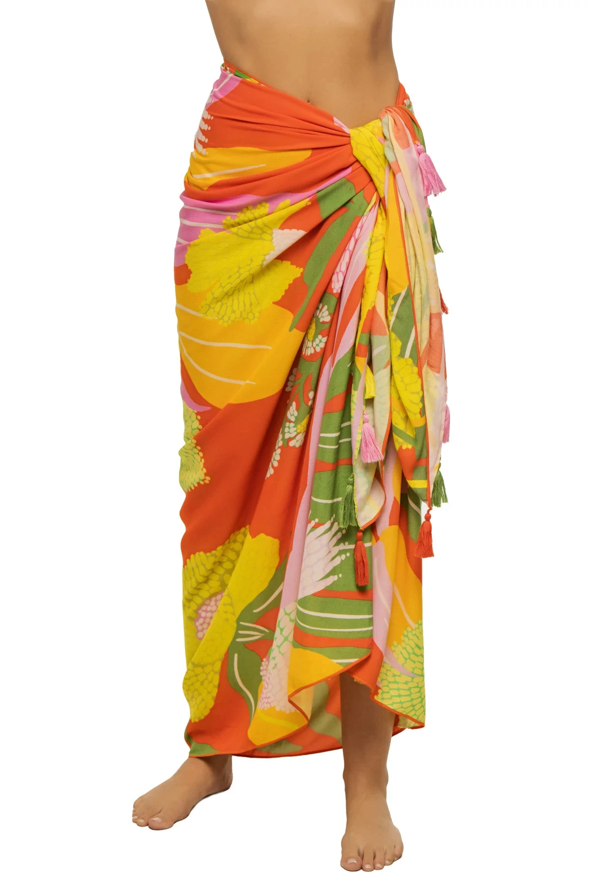 Neon floral sarong features a multi-colored tassel hem and offers a self tie waist.
