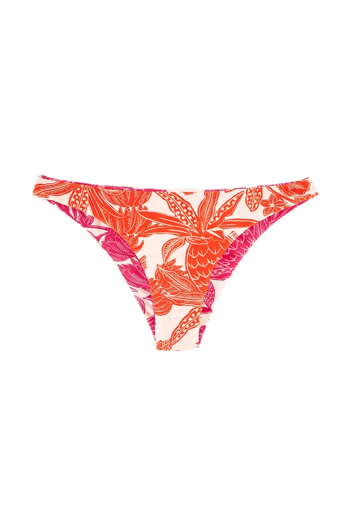 Tropical woodcut bikini bottom features a bright tropical print that reverses from pink to orange and offers minimal bottom coverage.