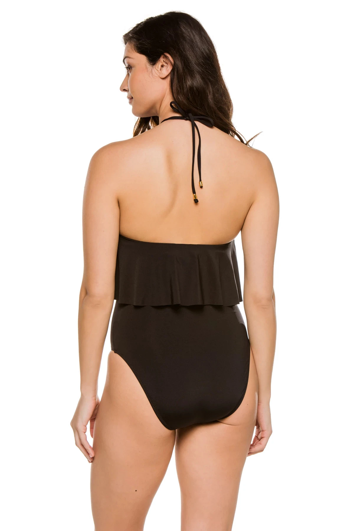 Flutter high neck one piece swimsuit features a ruffle overlay at bust, removable cups, and a floral connector to adjustable neck ties.