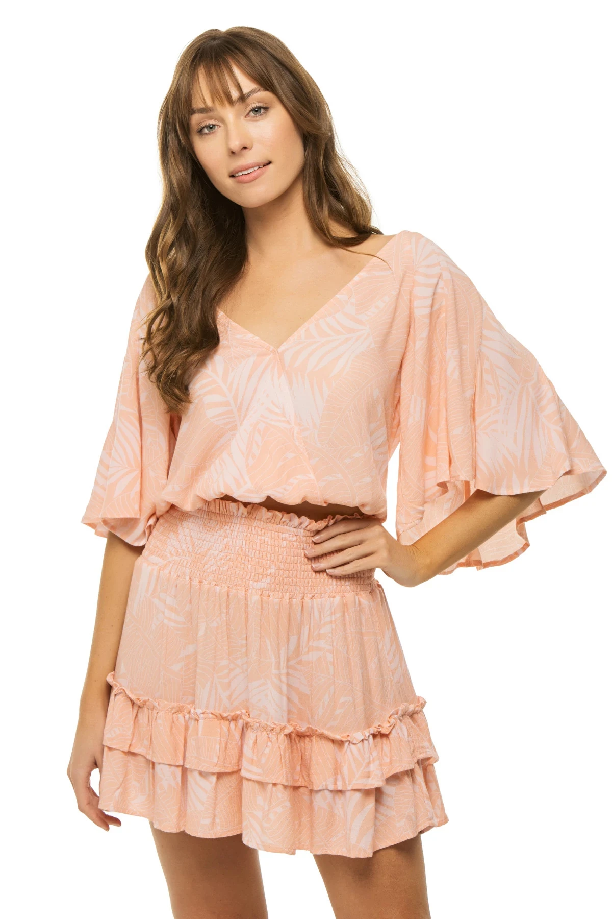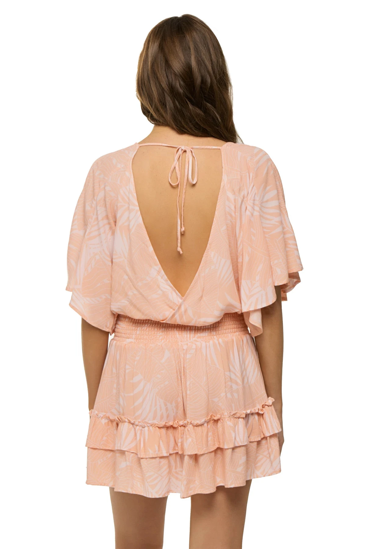 Crop top features a v-neck with wide flutter sleeves and offers an open back with neck ties and an elastic hem.
