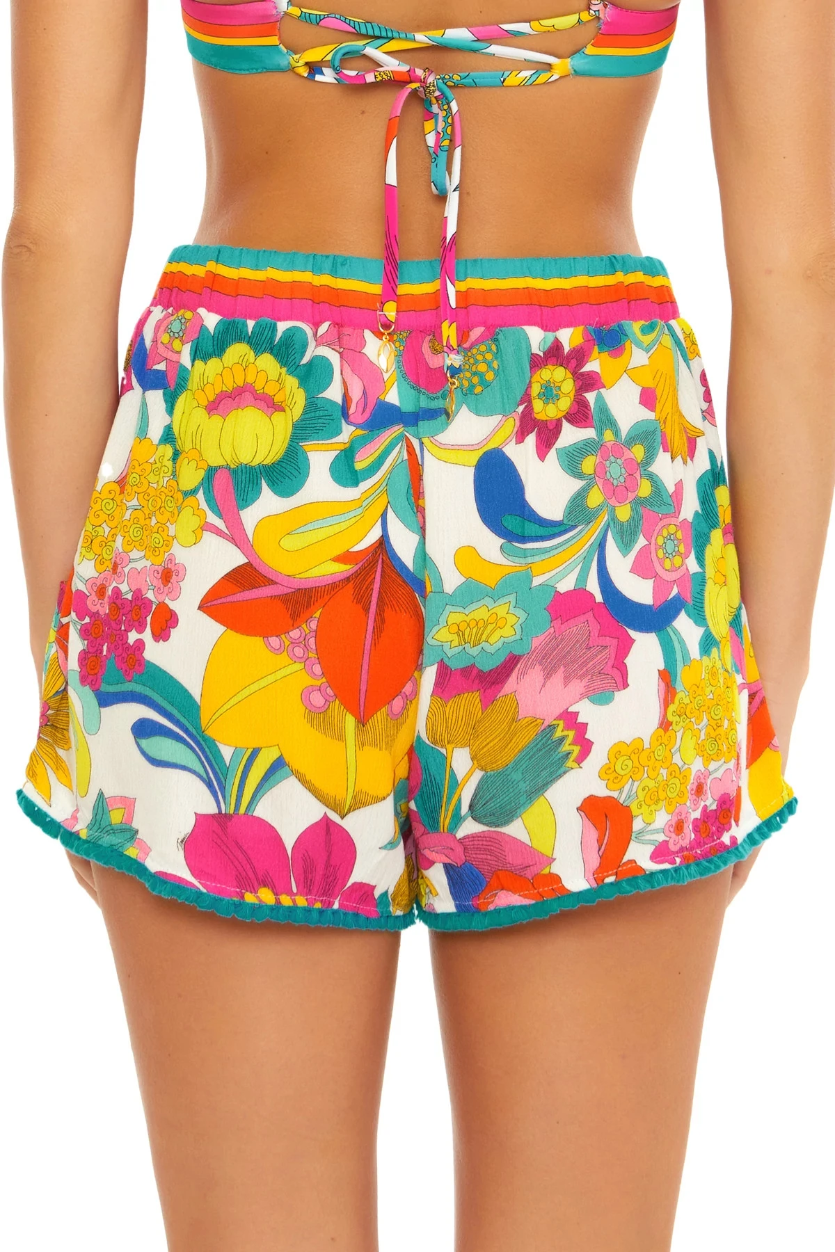 Fontaine shorts features a vibrant floral print with front pockets and a fringe hem.
