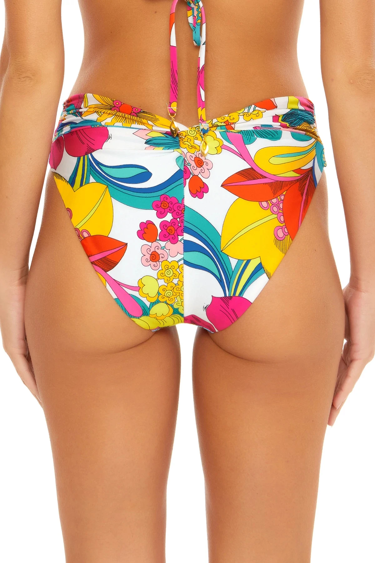 Fontaine high waist bikini bottom features a vibrant floral print with a twist back detail and offers a high leg cut with moderate coverage.