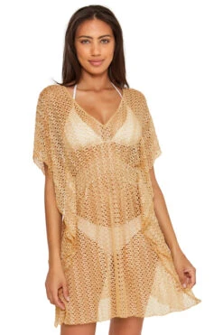 Golden metallic pull-over tunic features an intricate textured design with metallic accents and offers flutter sleeves with side slits and a plunging neckline.