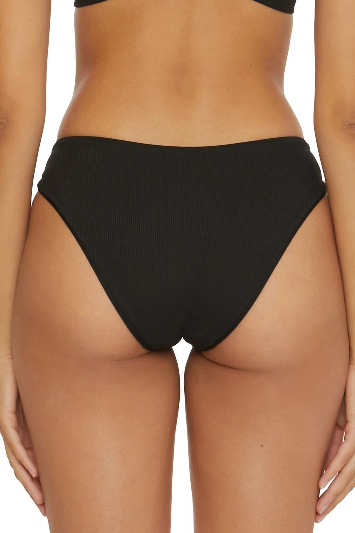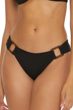 Gracie hipster bikini bottom features a ribbed texture with lacquered square buckle sides and contrast rolled edging. Offers moderate coverage.