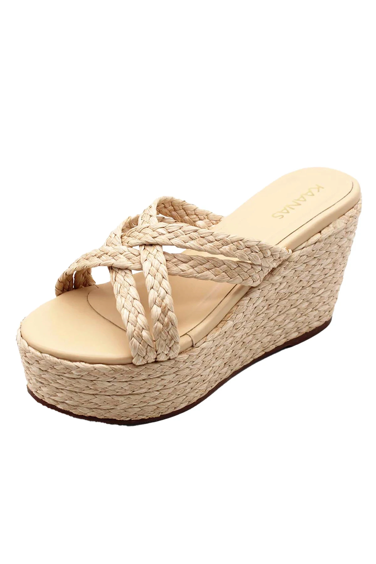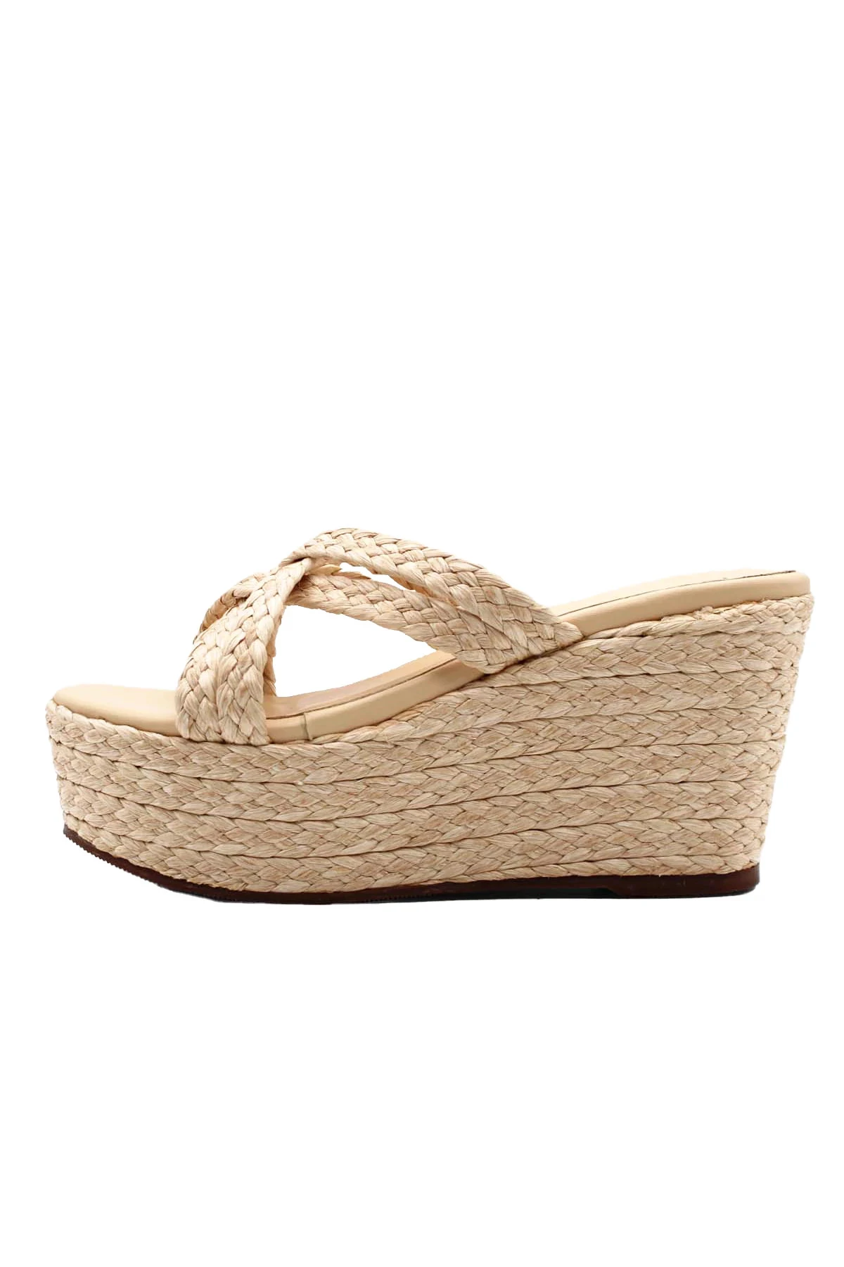 Guadalupe wedge features crisscross raffia straps.
