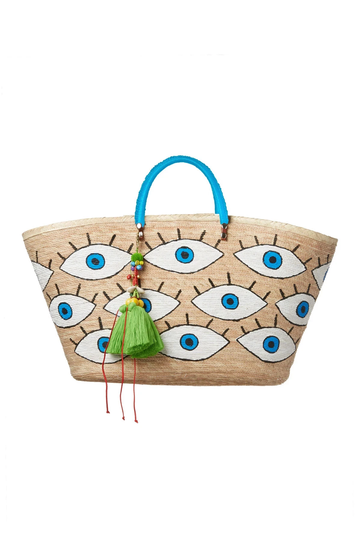 Hand painted evil eye tote features a multi-colored beaded, tassel trim and leather handle. Includes a pouch and dust bag.