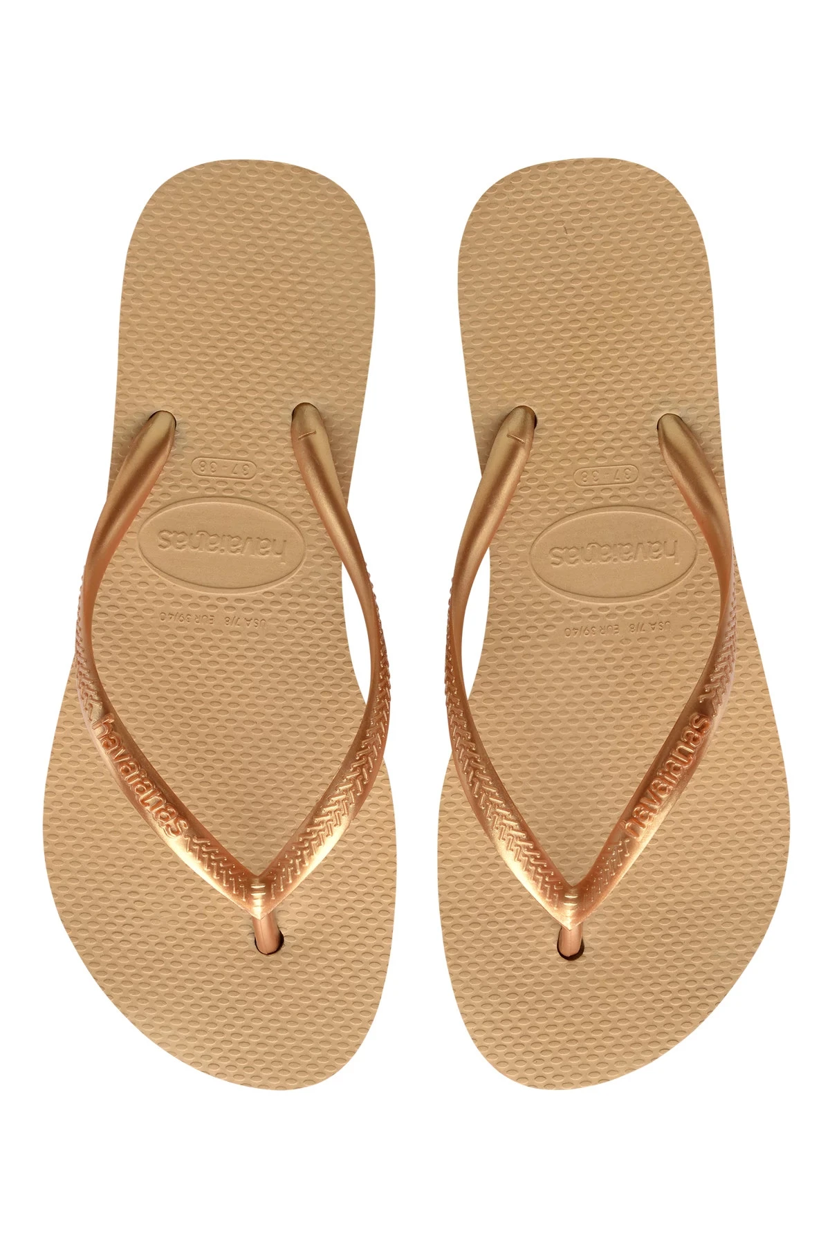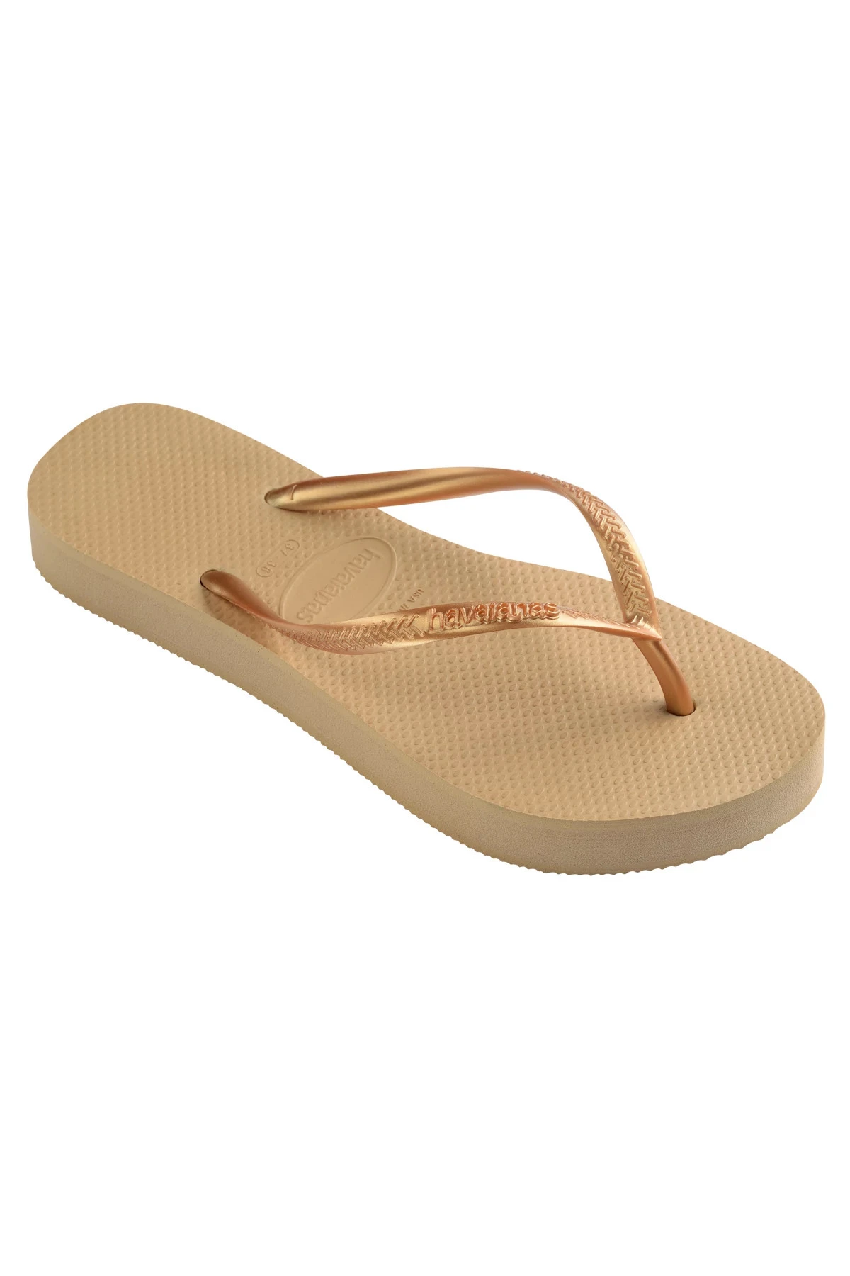 Rubber thong flip flops with platform base. Greek key pattern on strap, rice grain pattern on foot bed, and brick pattern on outer sole.