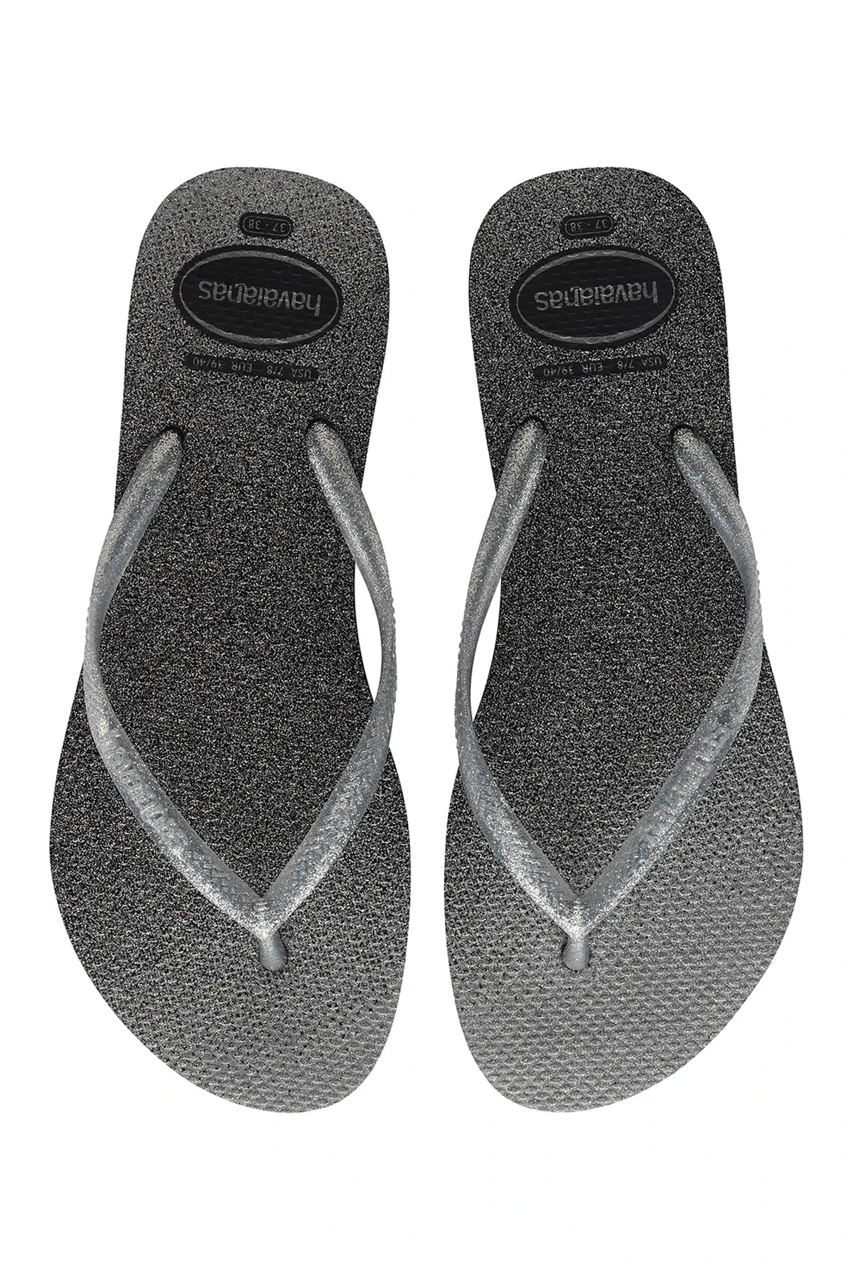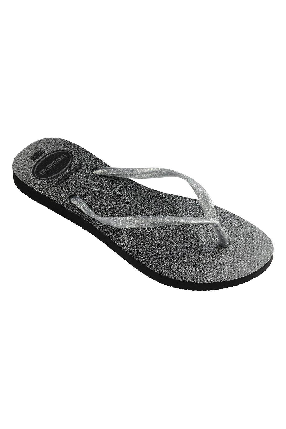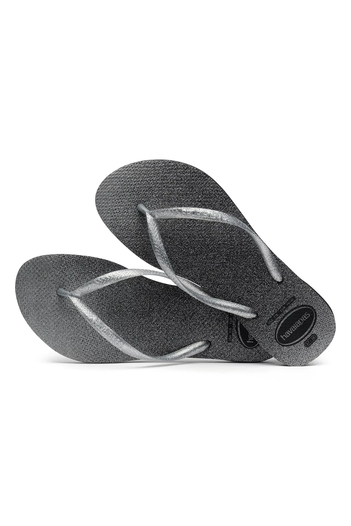 Slim Gloss flip flops feature glitter-injected thong straps and glitter-injected soles.