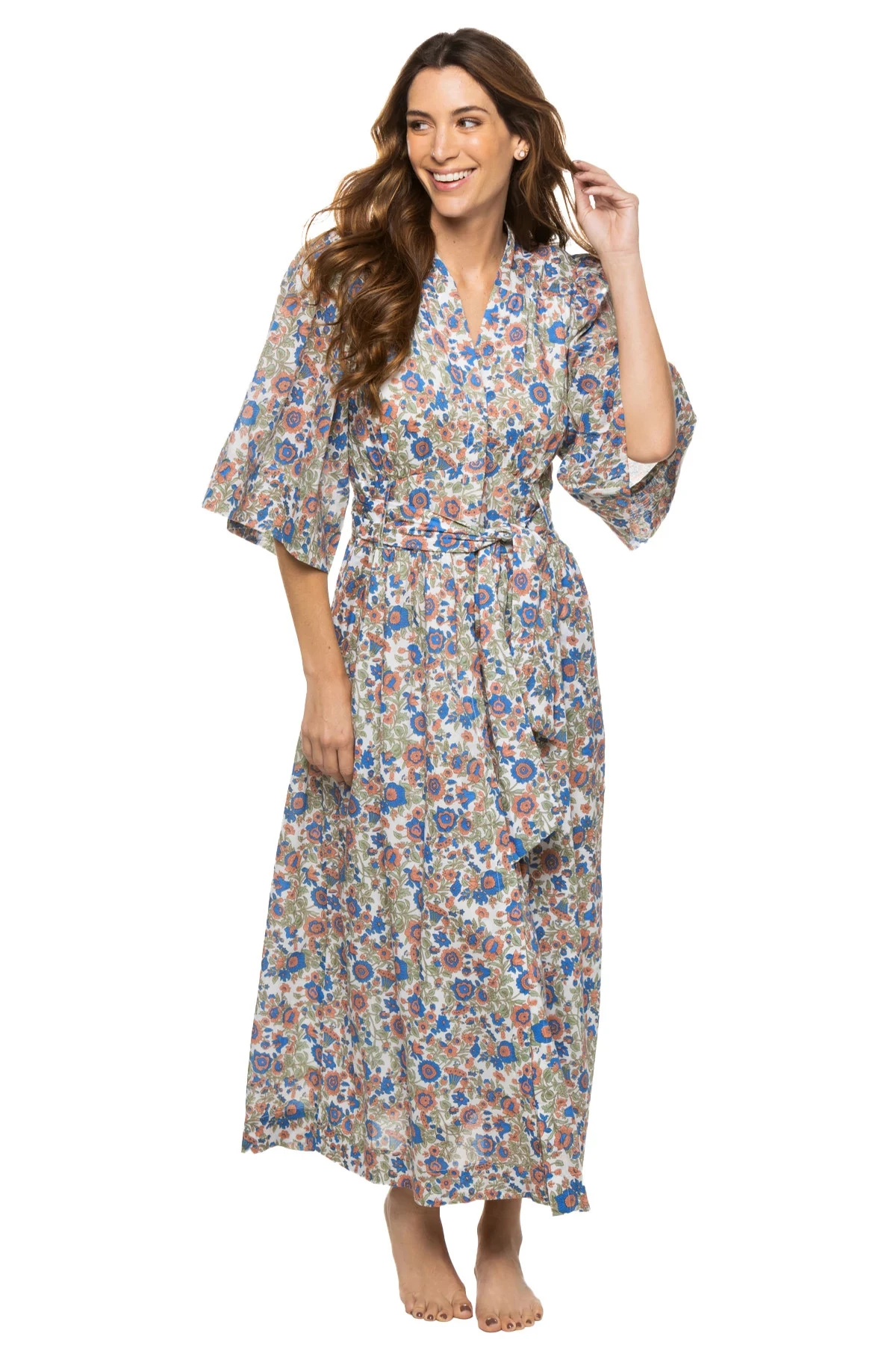 Hayannis maxi dress features a hand block printed fabrication done by hand in Bagru, India. With a split neckline that offers center front buttons, pockets and a fabric tie belt.